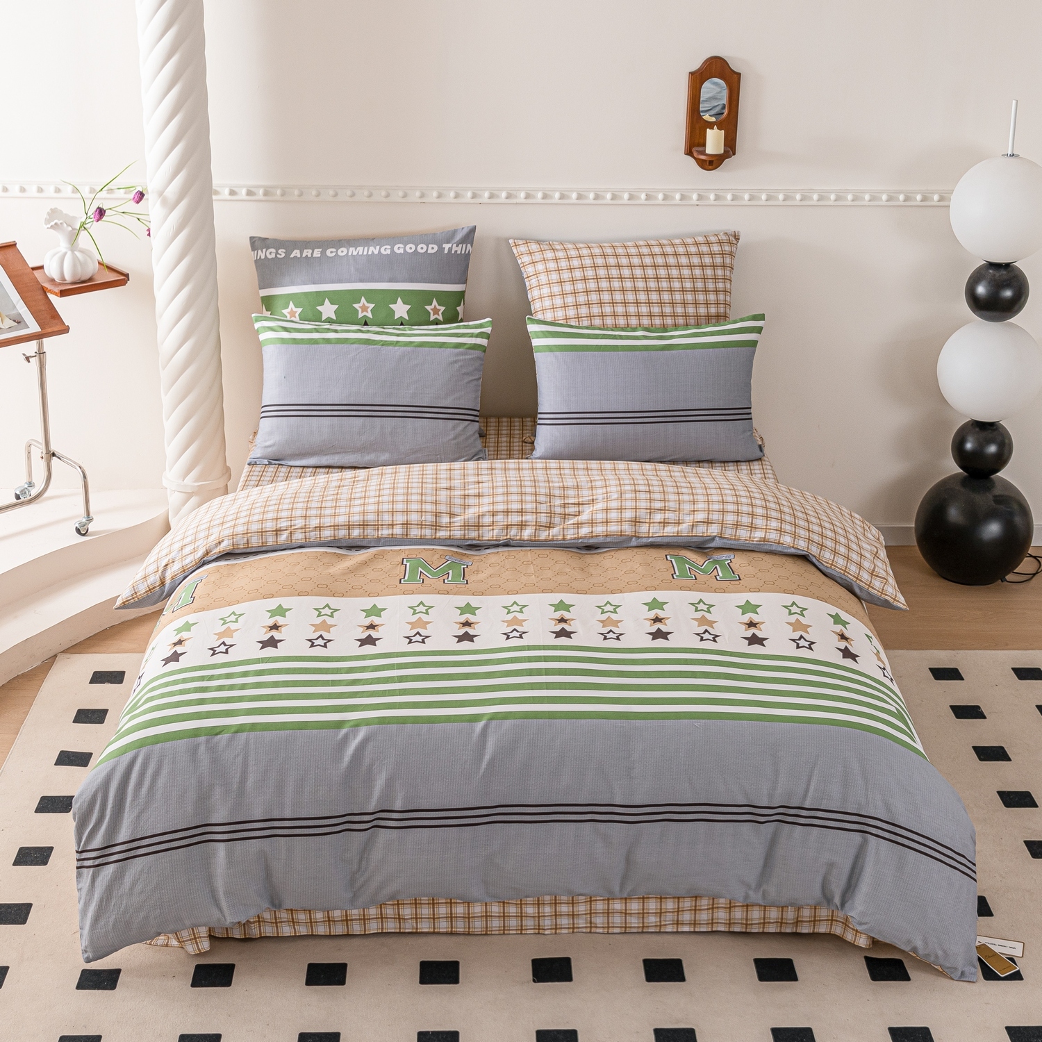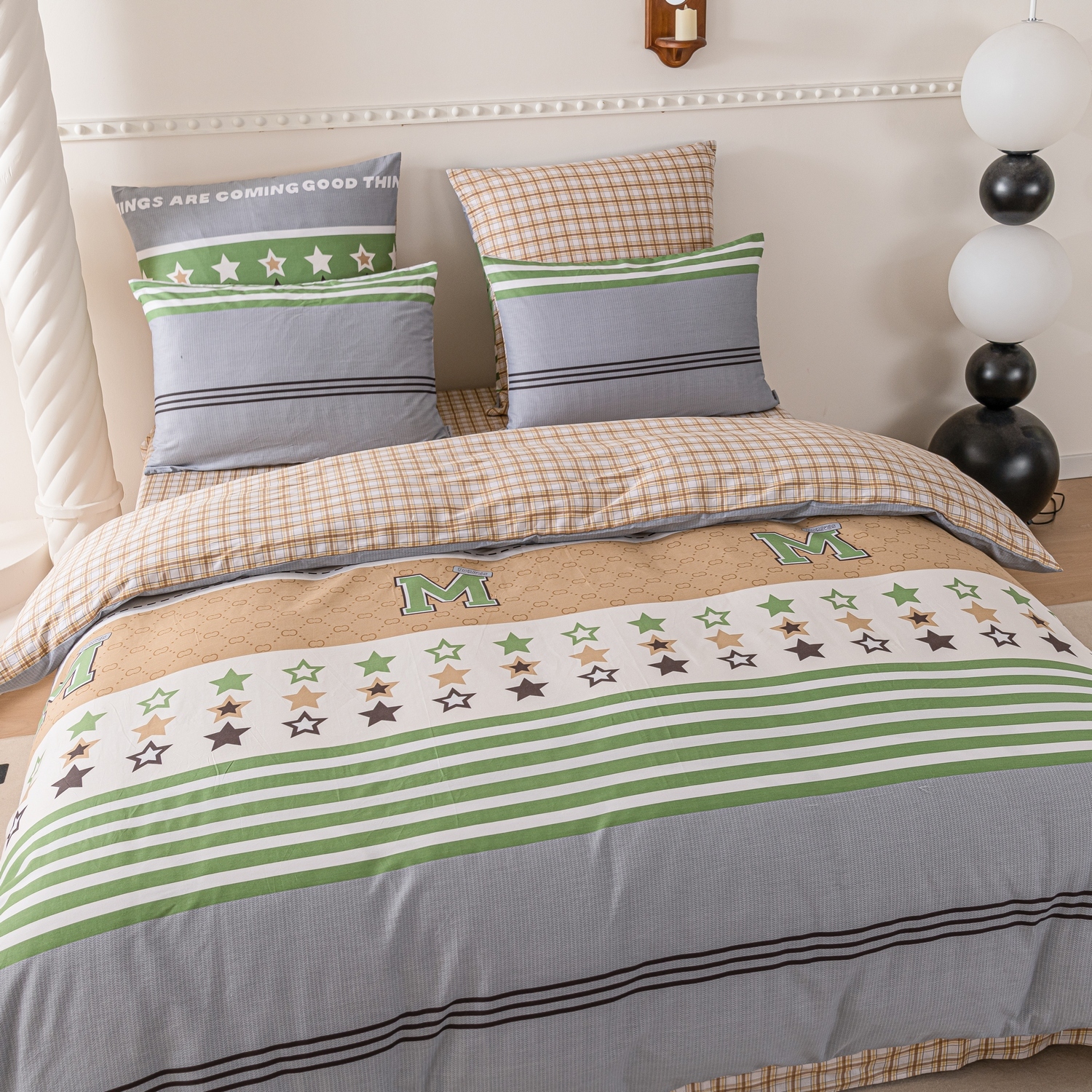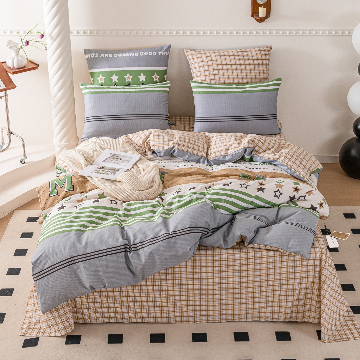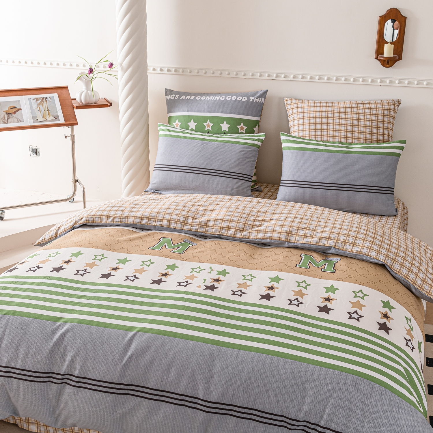 Ткань компаньон: Наволочки с разных сторон разной расцветки, пододеяльник с разных сторон разного цвета, простыня такого же цвета, как низ пододеяльника.