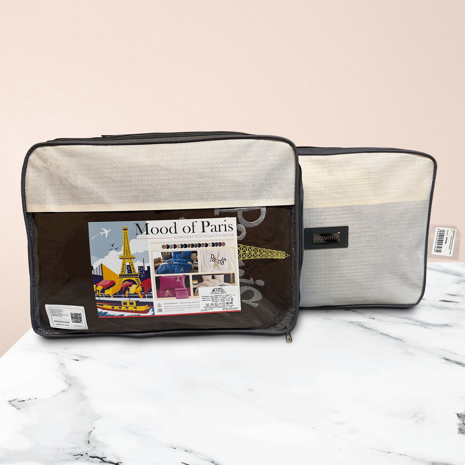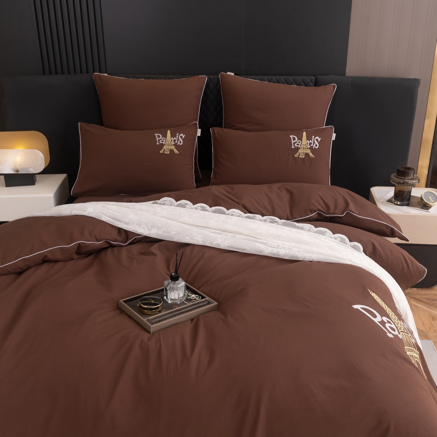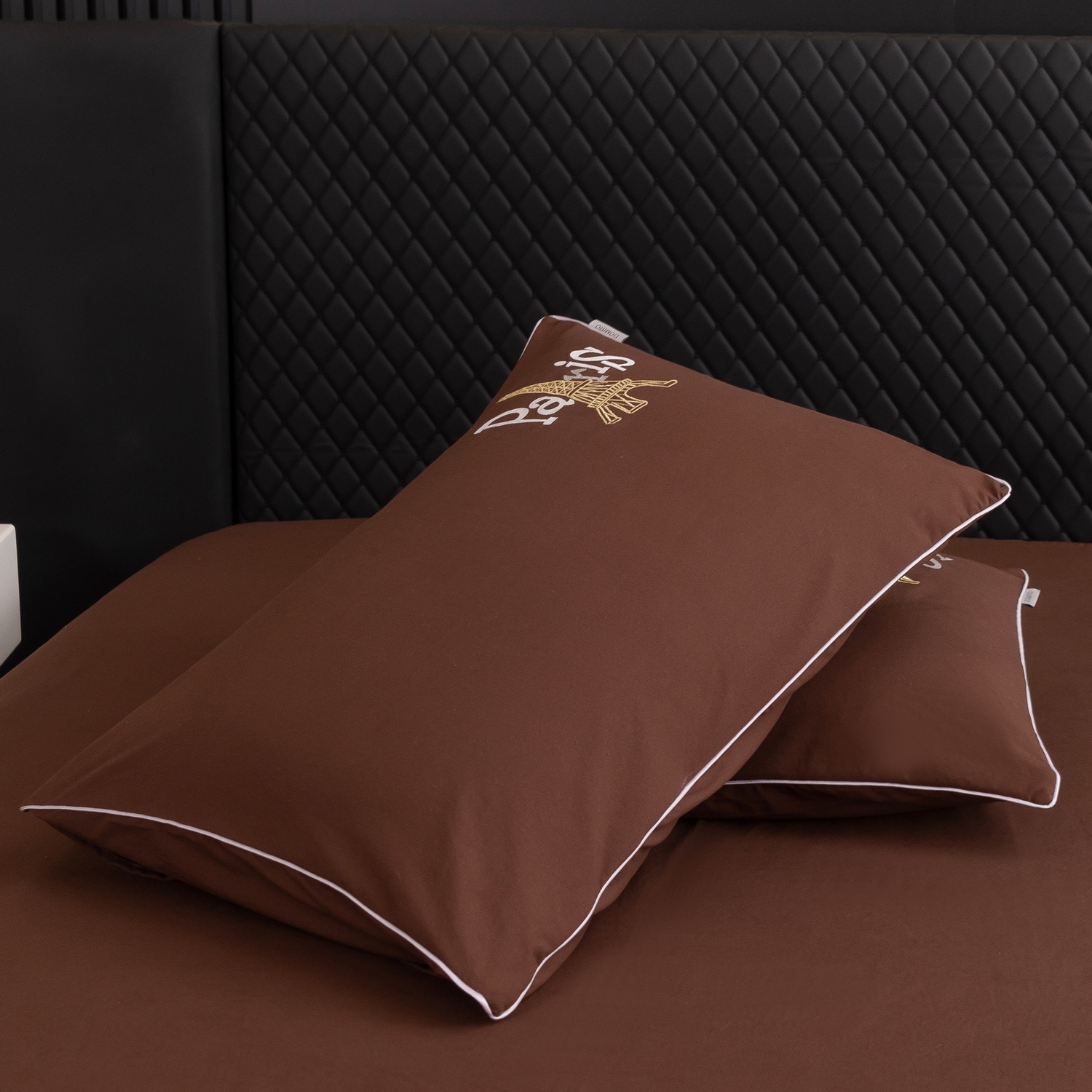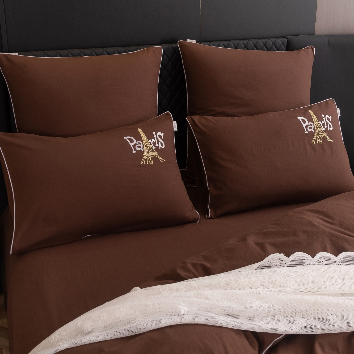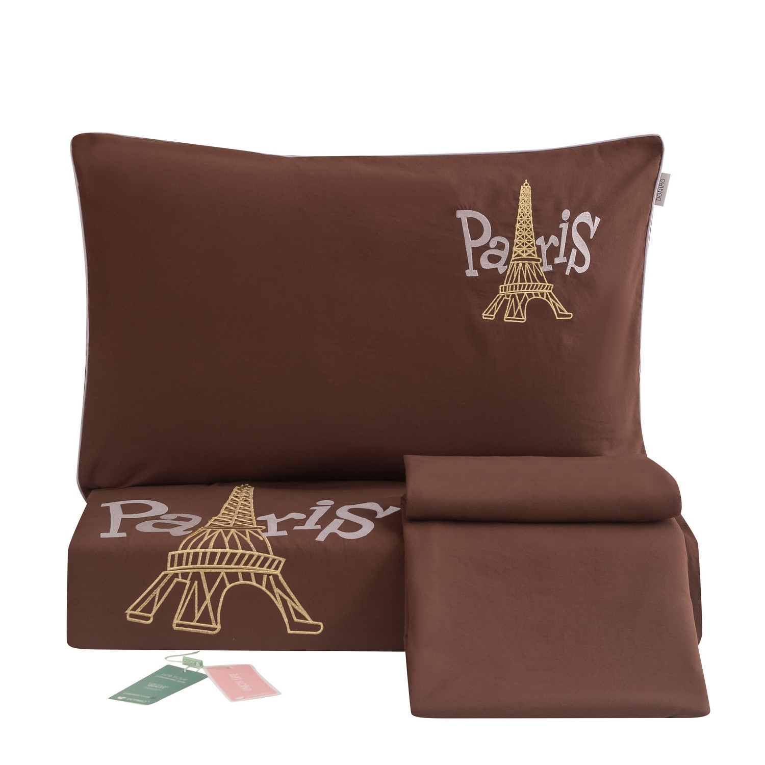 Дизайн дополняет элегантная вышивка с изображением Эйфелевой башни и надписью Paris/Париж, а изящный кант по периметру подчёркивает утончённость каждого комплекта.