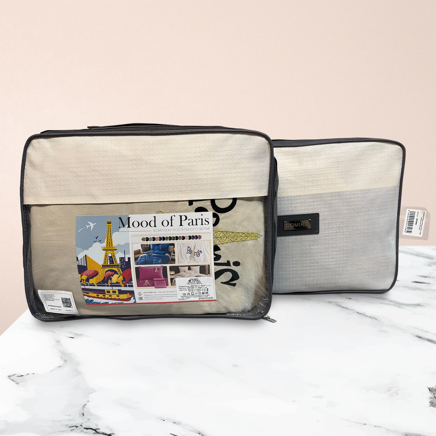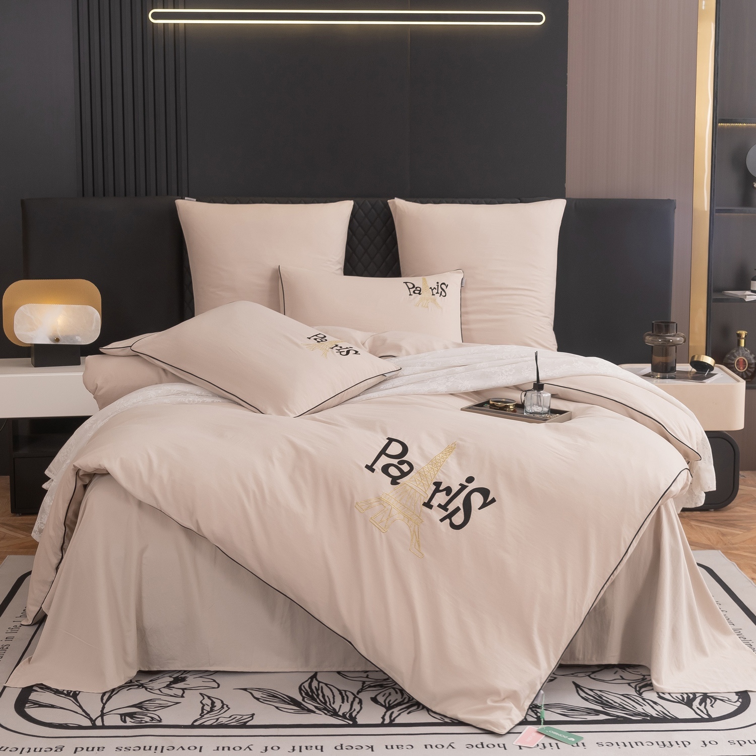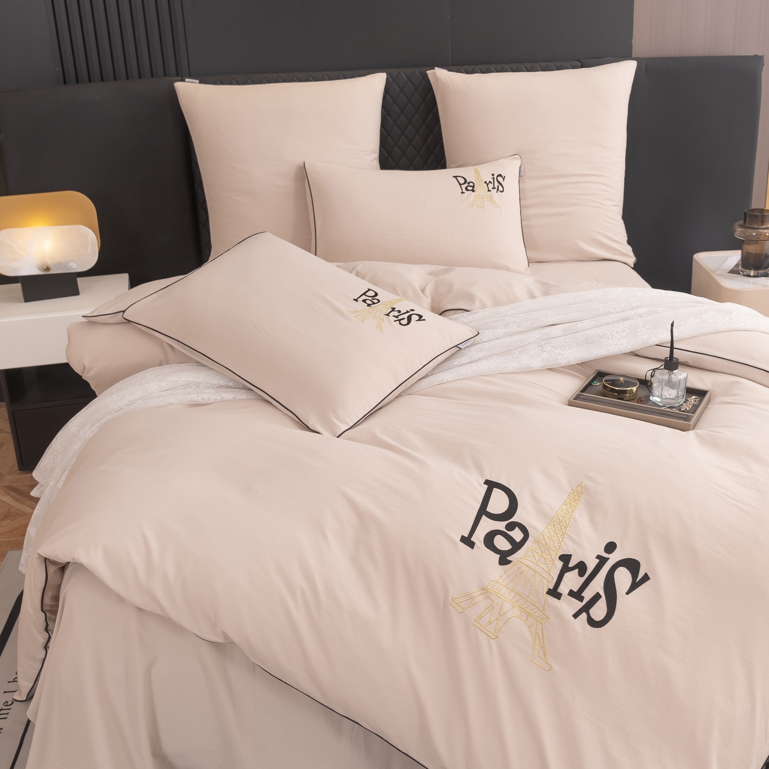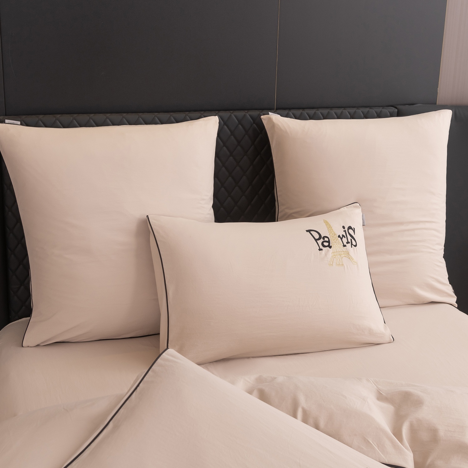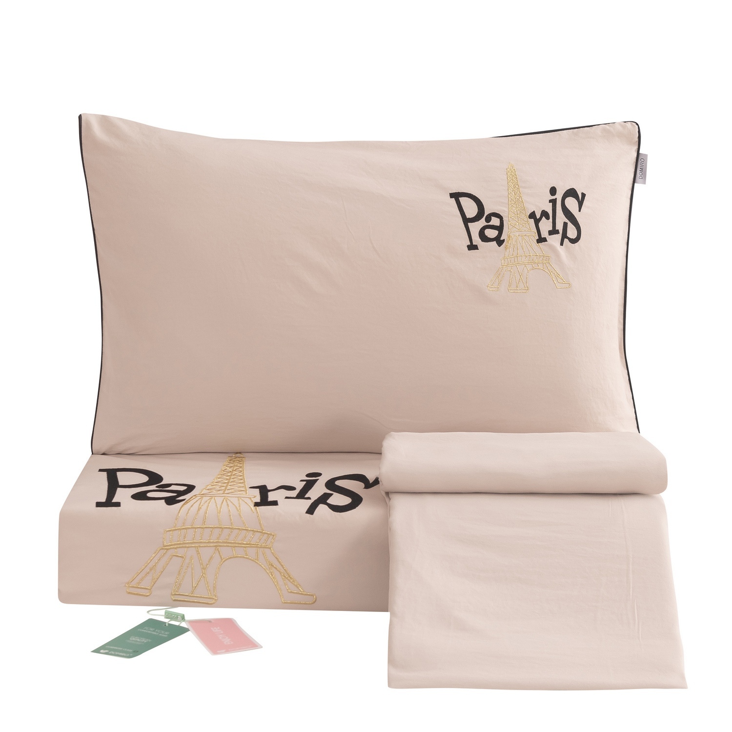 Дизайн дополняет элегантная вышивка с изображением Эйфелевой башни и надписью Paris/Париж, а изящный кант по периметру подчёркивает утончённость каждого комплекта.