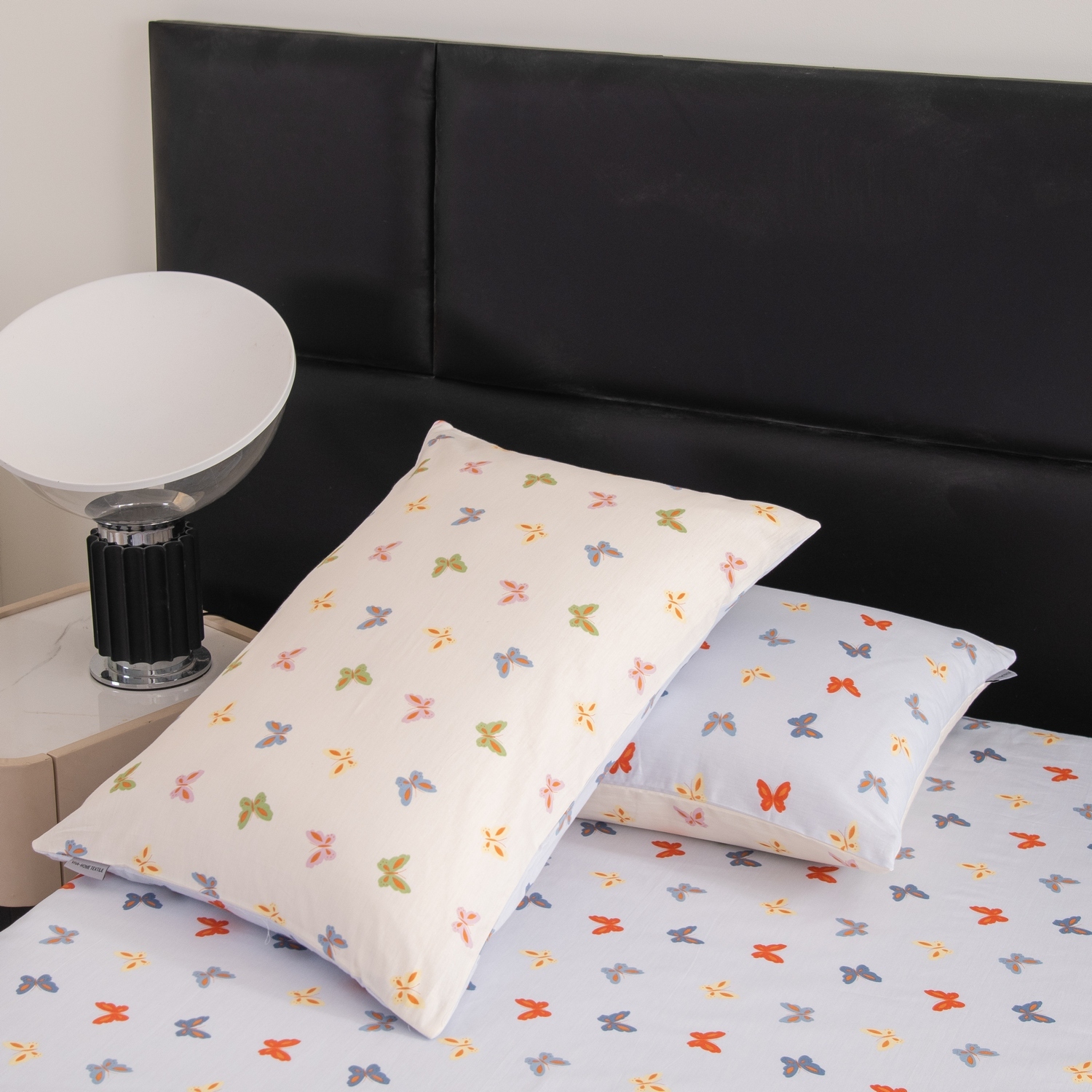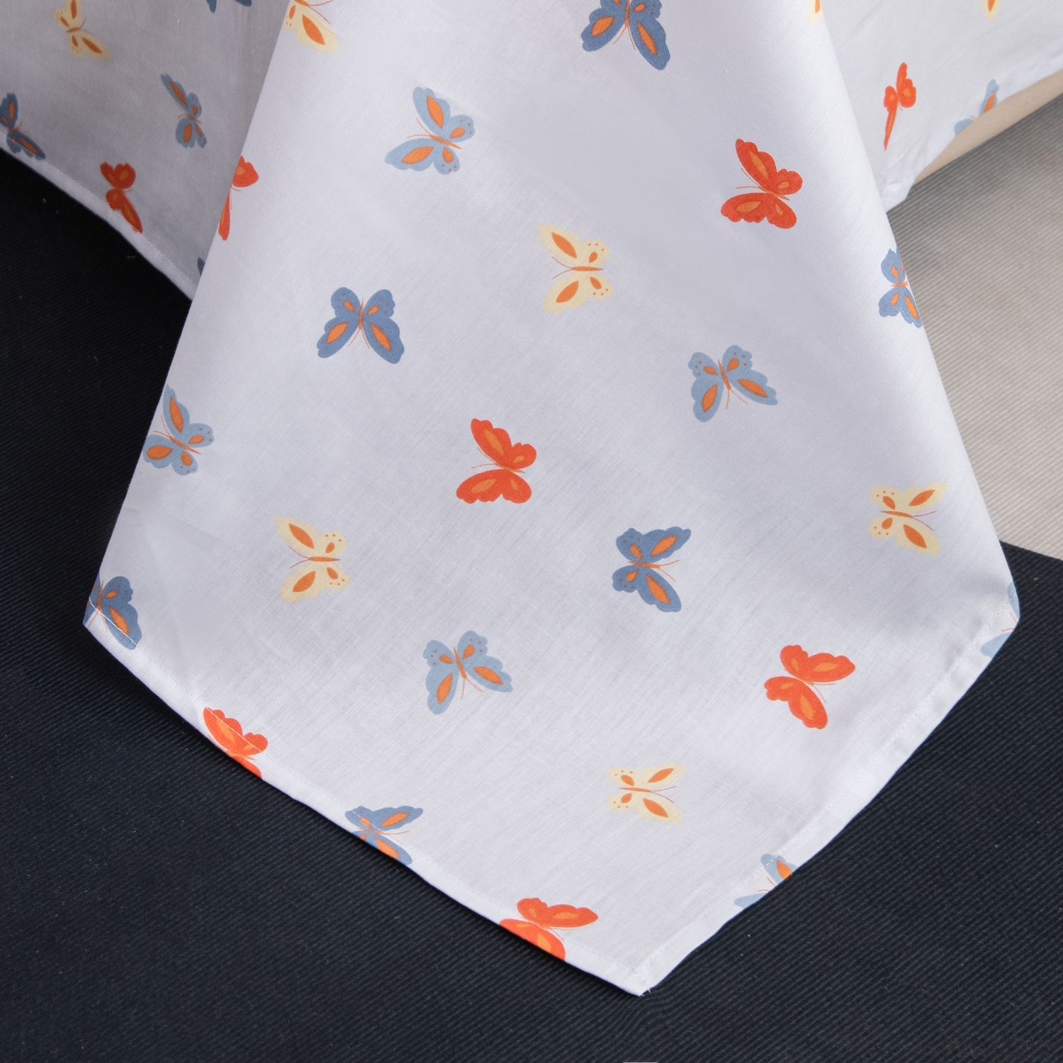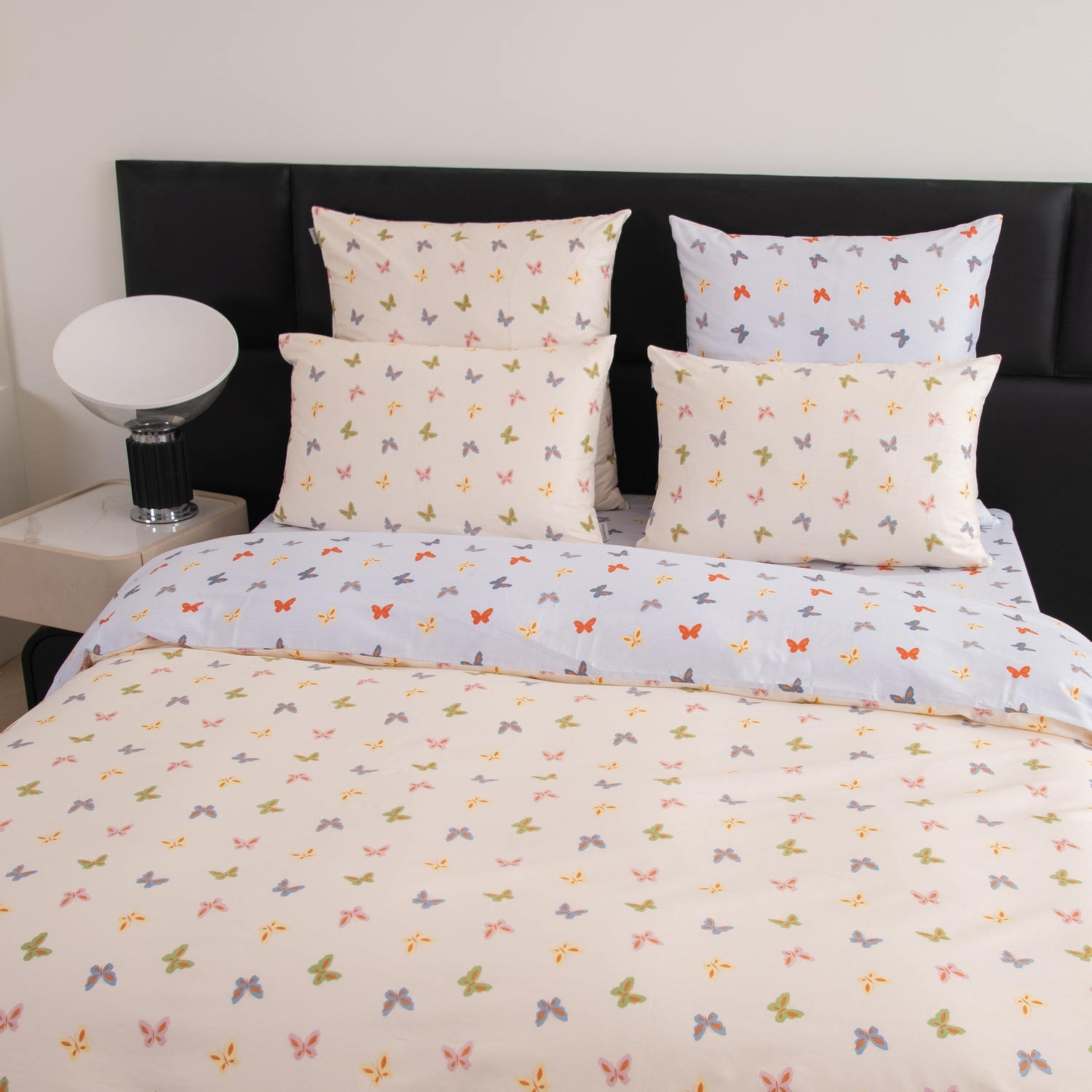 Ткань компаньон: Наволочки с разных сторон разной расцветки, пододеяльник с разных сторон разного цвета, простыня такого же цвета, как низ пододеяльника.