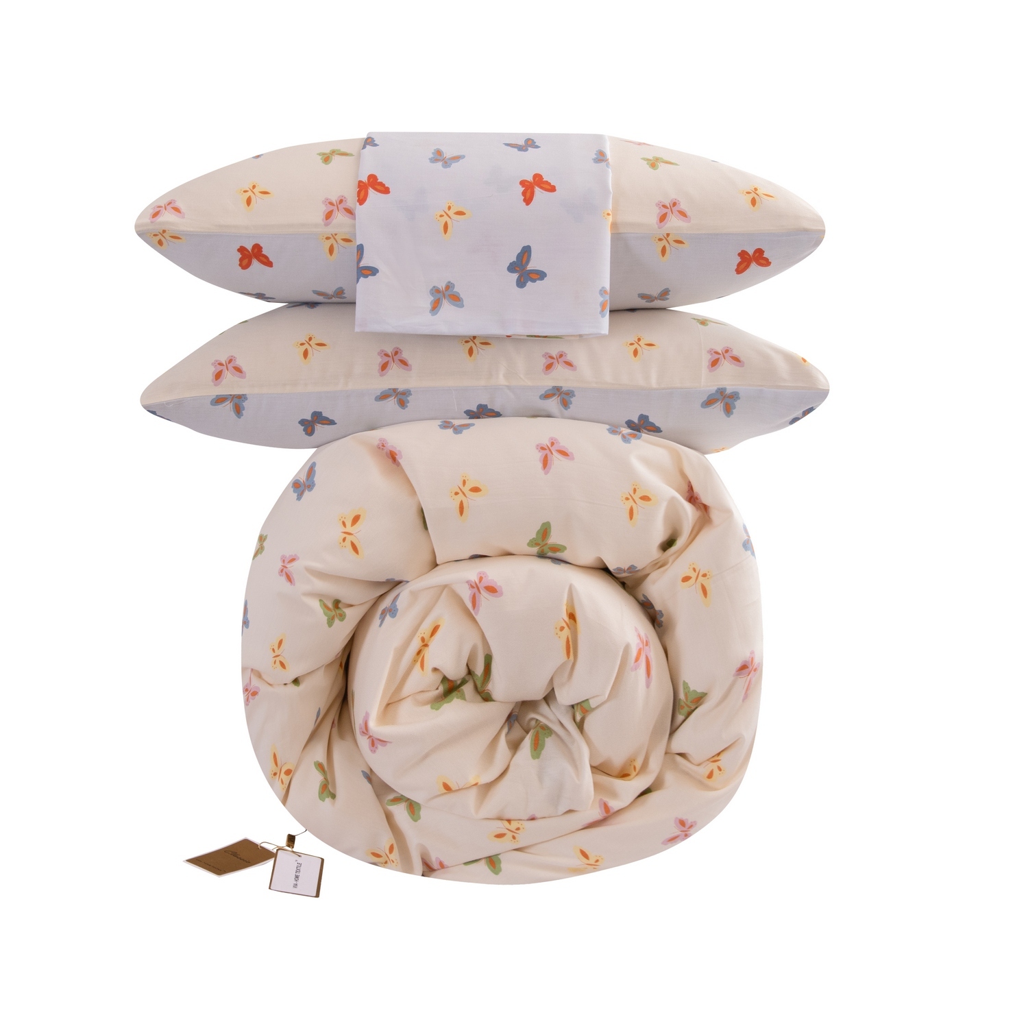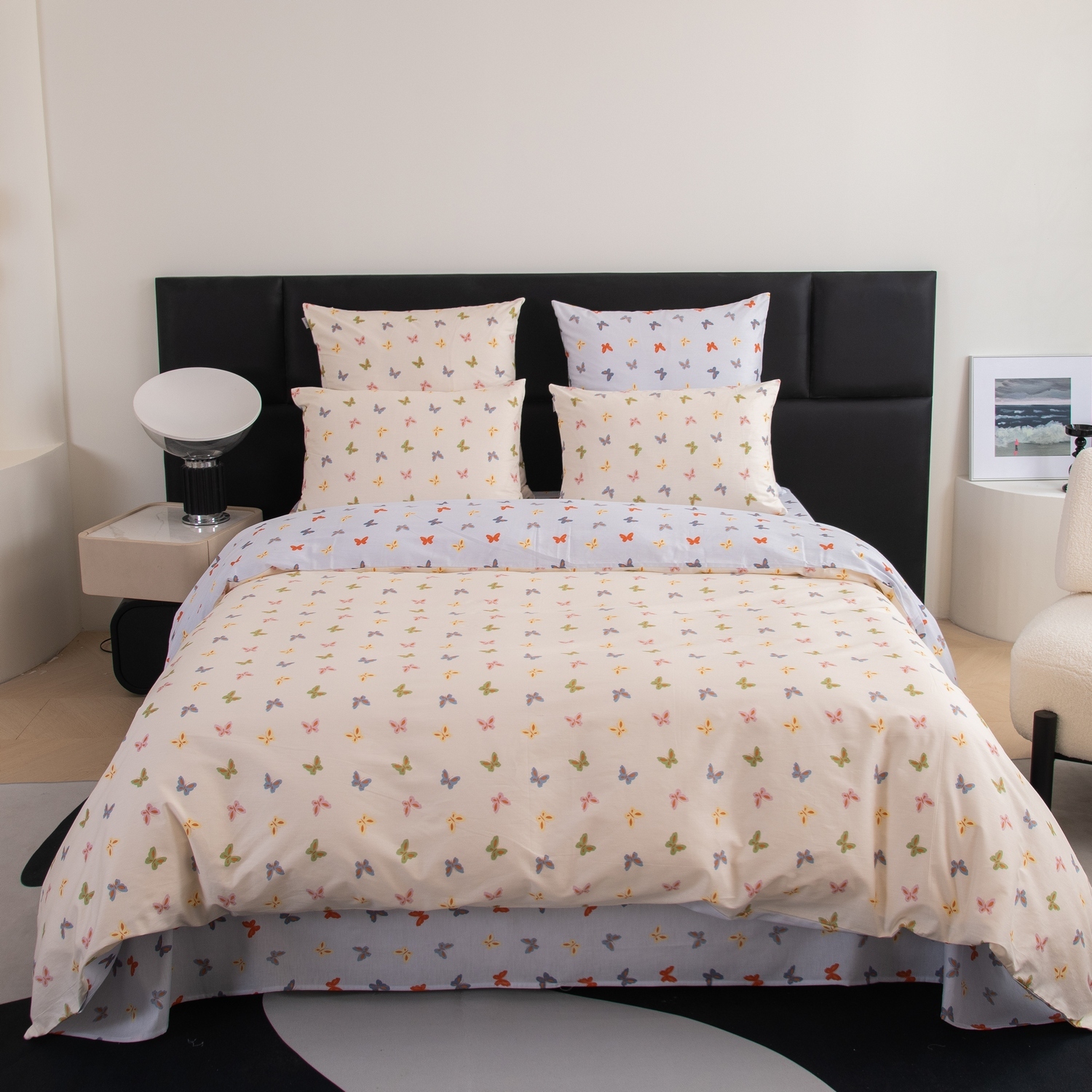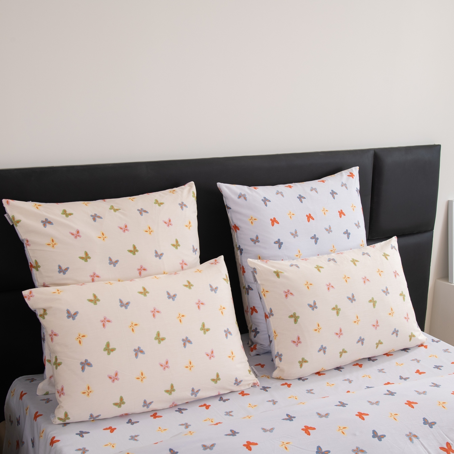 Ткань компаньон: Наволочки с разных сторон разной расцветки, пододеяльник с разных сторон разного цвета, простыня такого же цвета, как низ пододеяльника.