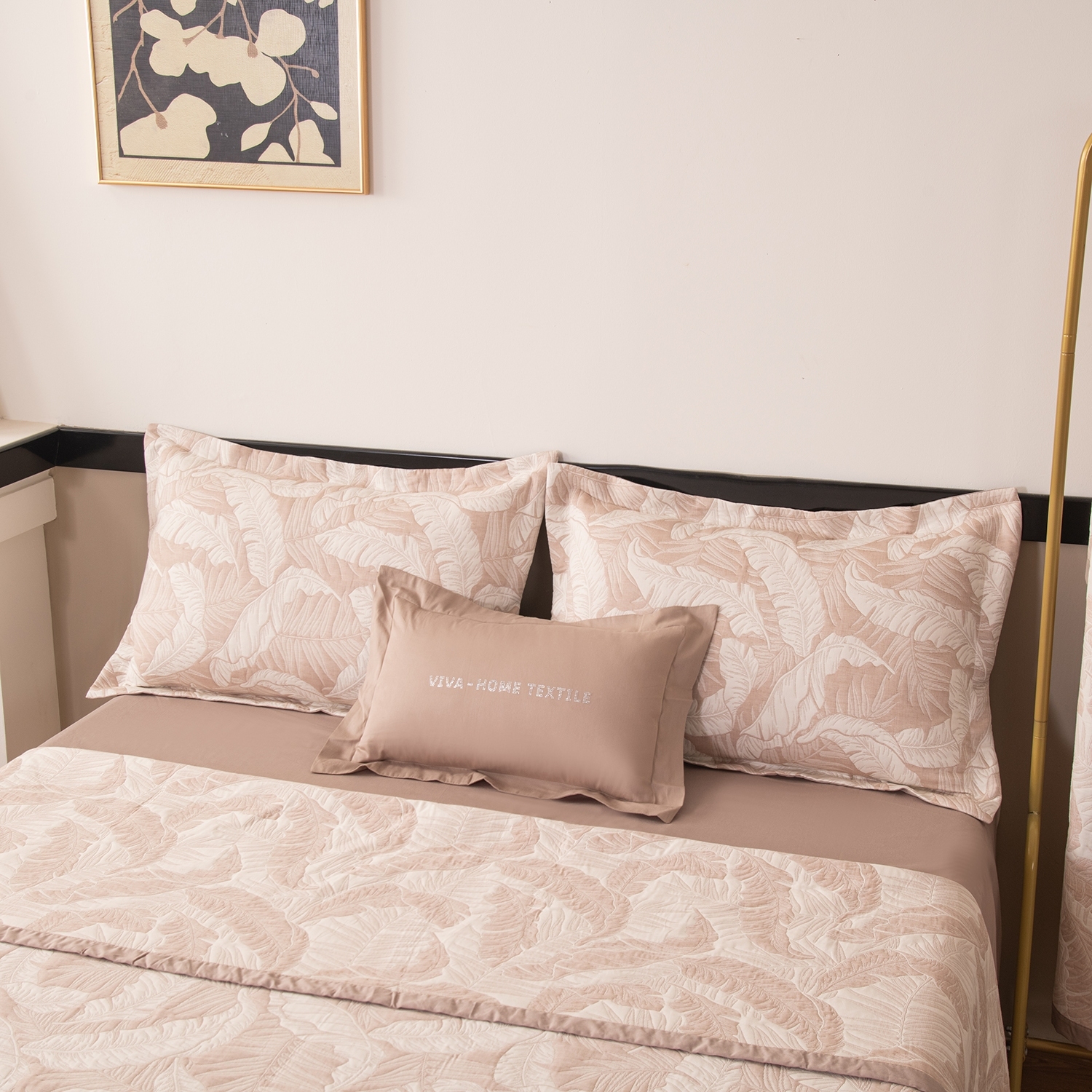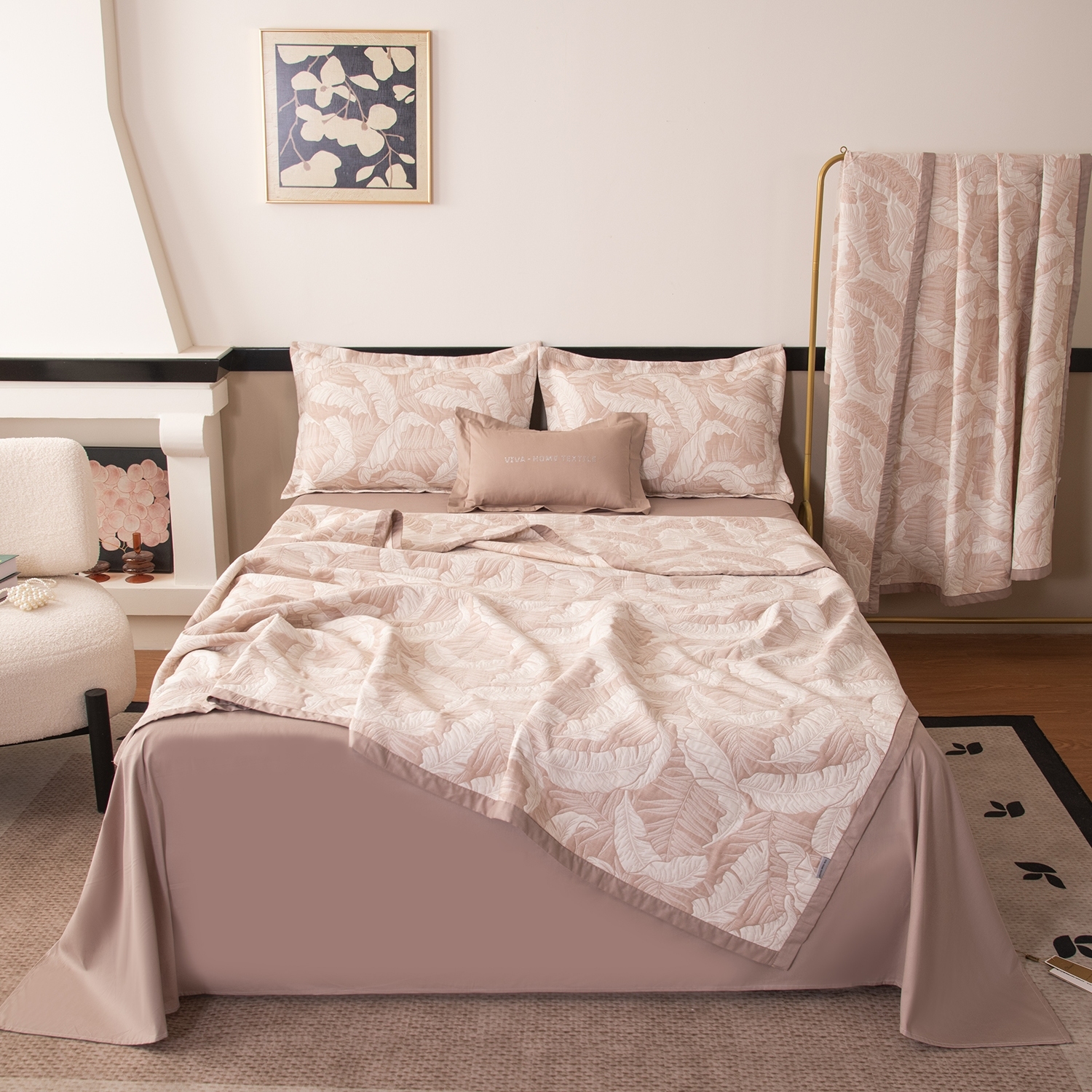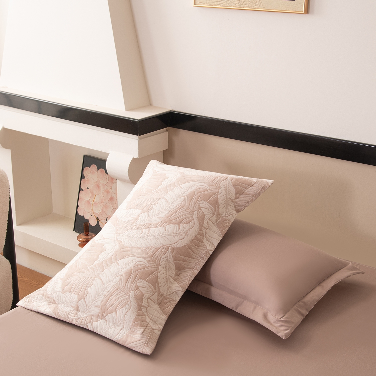 Покрывало выполнено из жаккардового муслина с декоративной простёжкой, формирующей утончённый рельефный узор. Ткань отличается мягкостью, лёгким благородным блеском и изысканной текстурой. Завершает композицию широкий кант в тон простыни, который визуально объединяет все элементы комплекта и придаёт образу гармоничную завершённость.