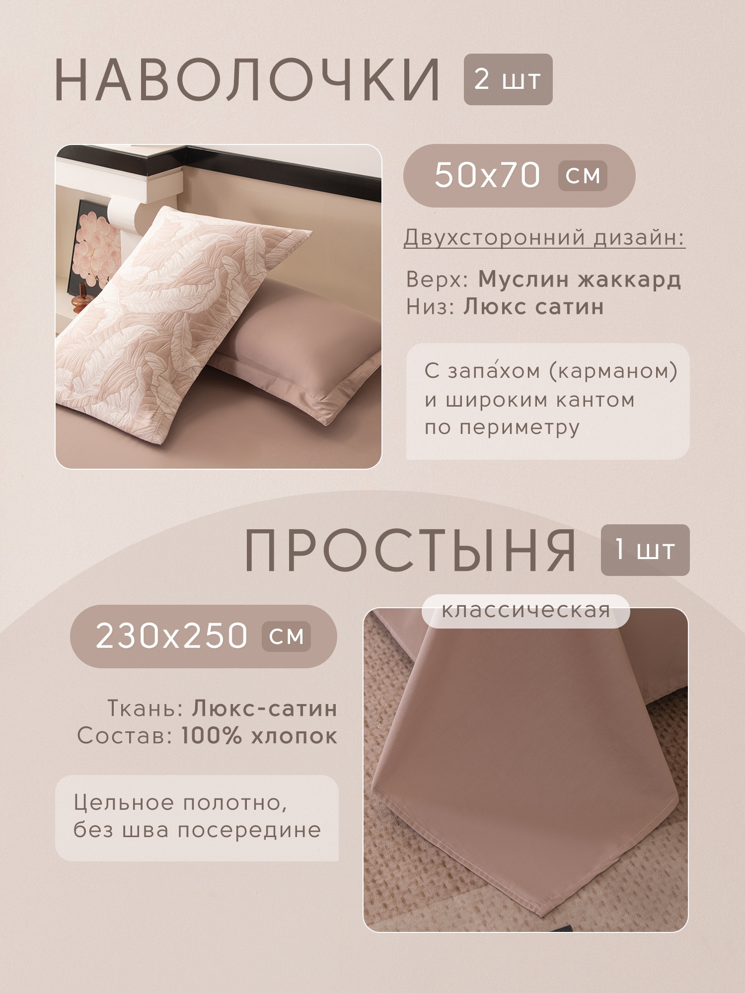 В комплект также входят однотонная простыня из люкс-сатина и две двусторонние наволочки с широким кантом по периметру. Одна сторона наволочек выполнена из жаккардового муслина с тем же изящным узором, что и покрывало, другая - из гладкого люкс-сатина, что даёт возможность комбинировать и создавать новые вариации оформления постели.