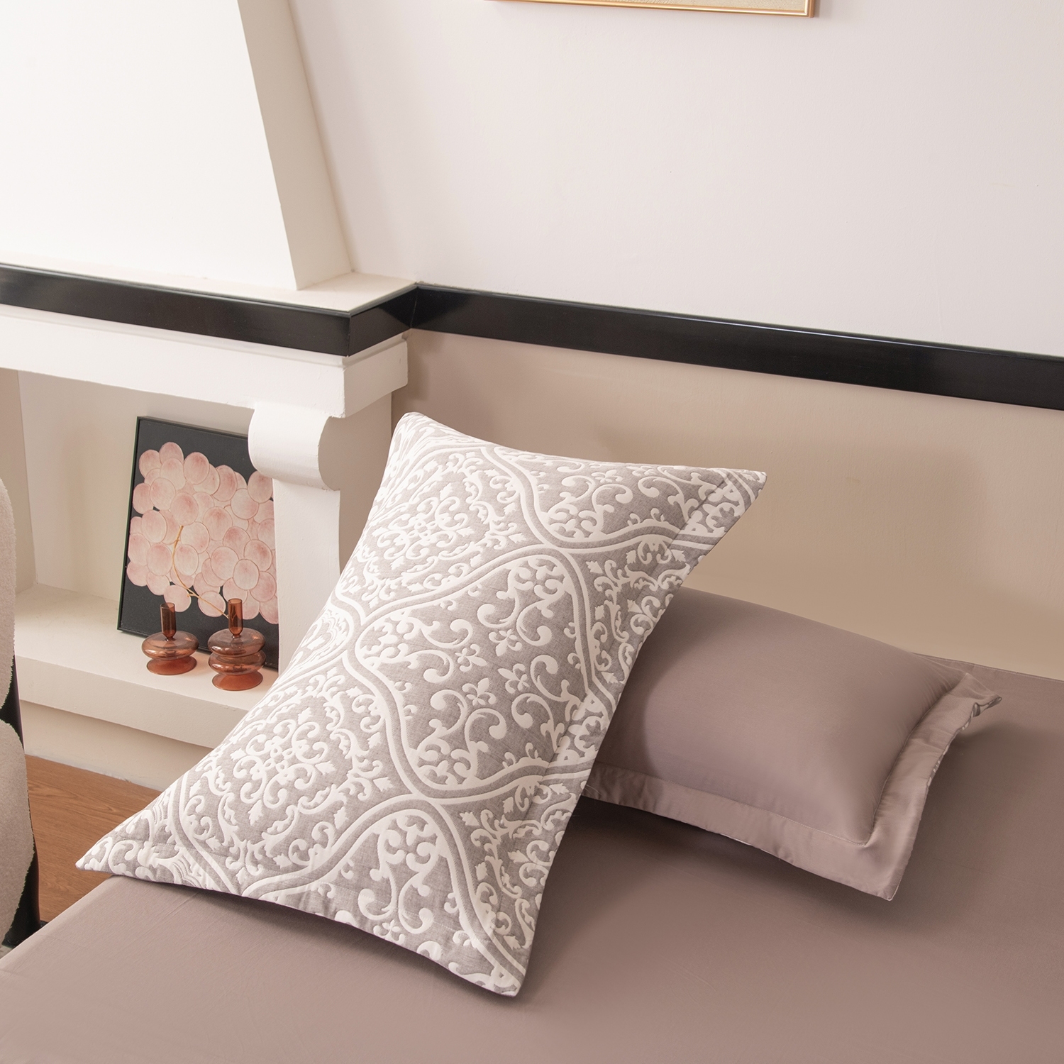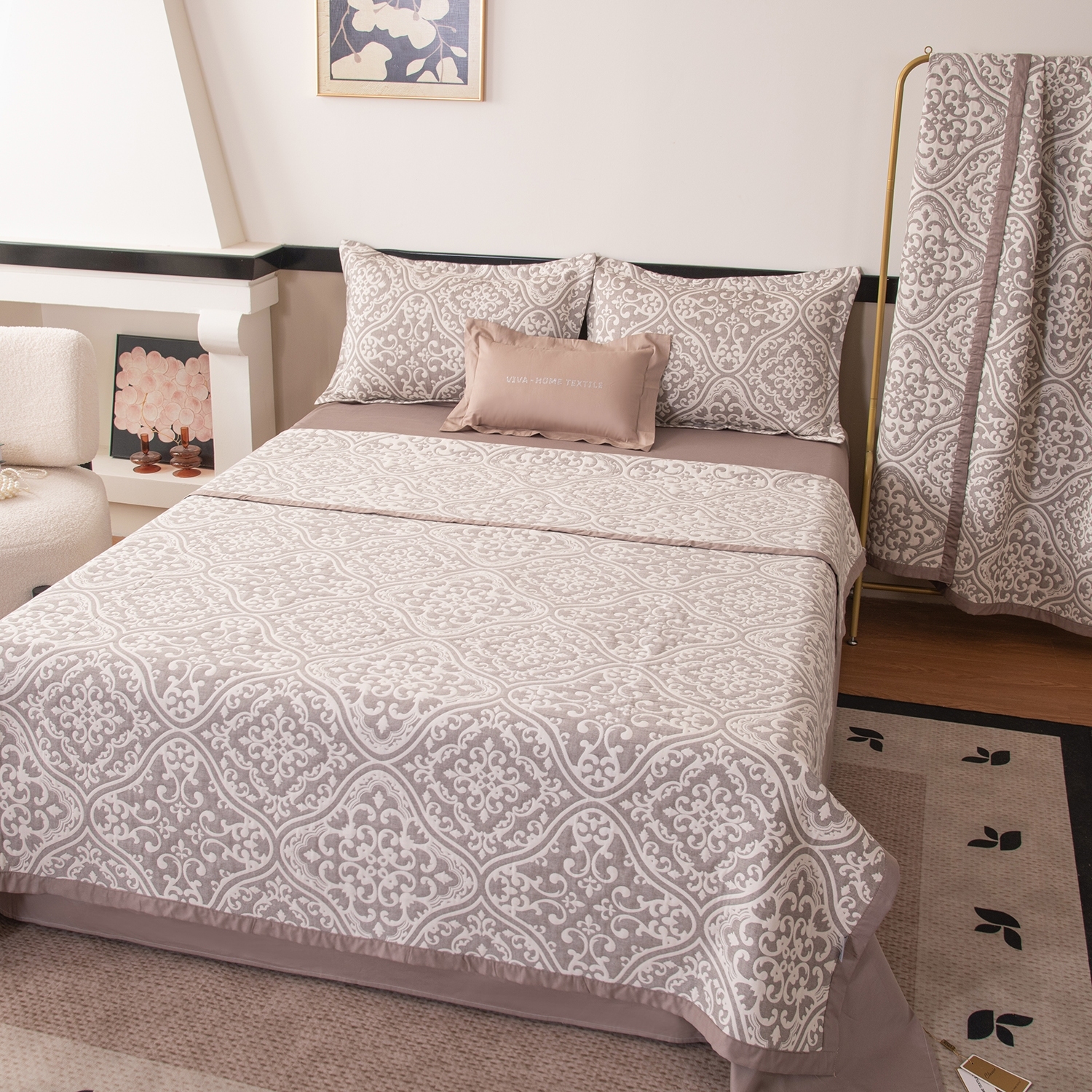 Реверсивный дизайн покрывала с инверсией оттенков позволяет выбрать настроение пространства: на одной стороне - светлый фон с мягким контрастным рисунком, на другой - более тёмный фон со светлым узором. Игра фактур и тонов делает покрывало выразительным акцентом в интерьере и позволяет легко менять облик спальни.