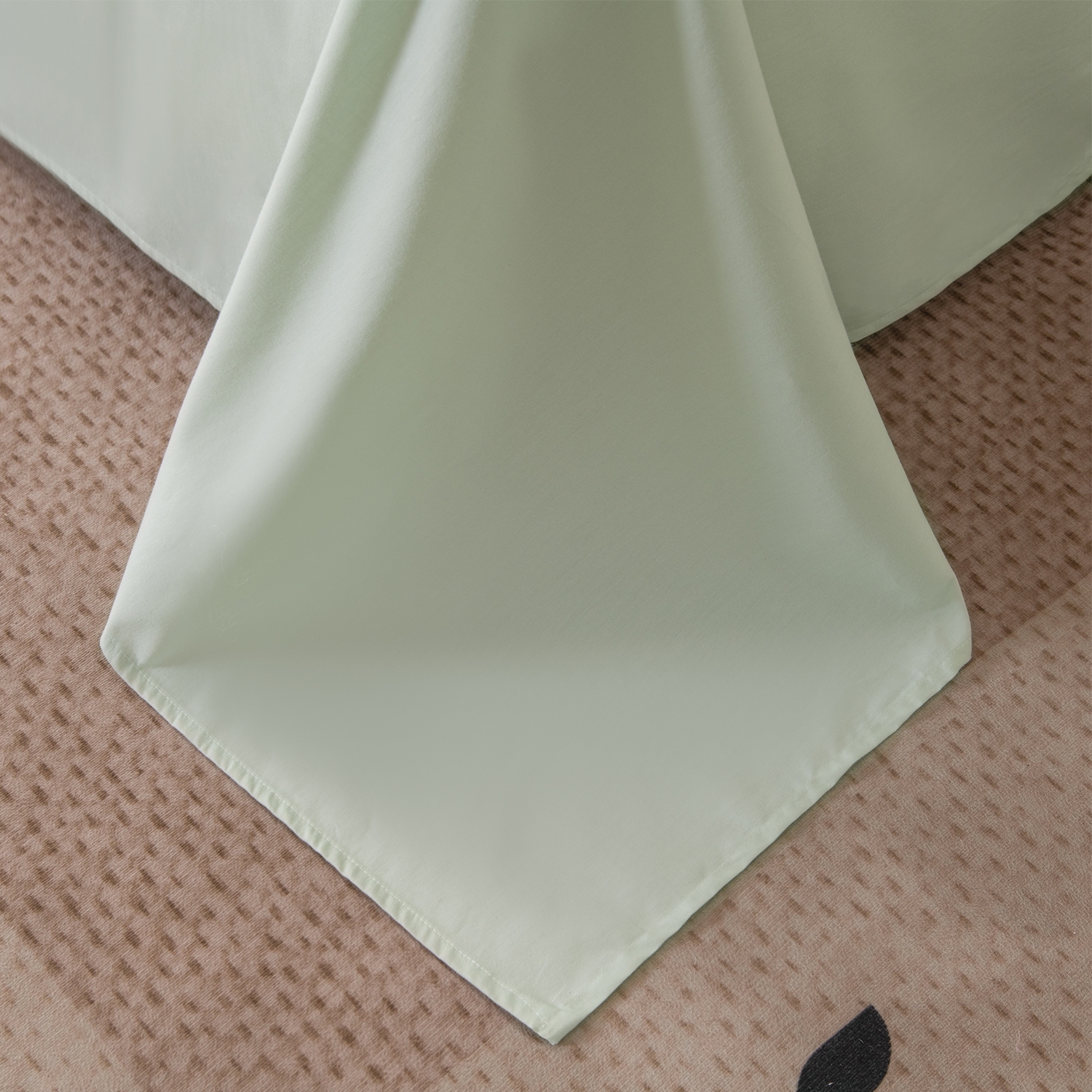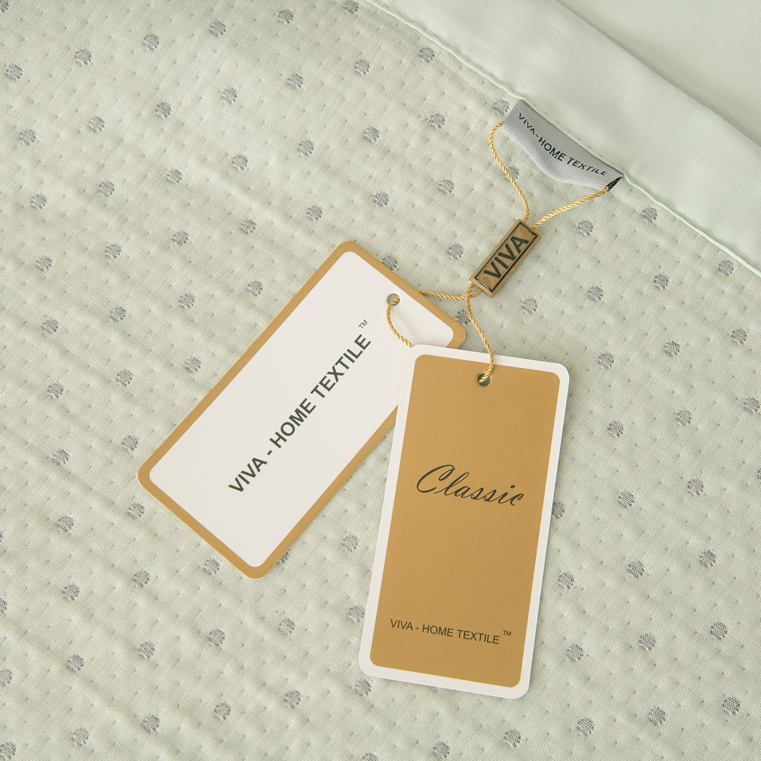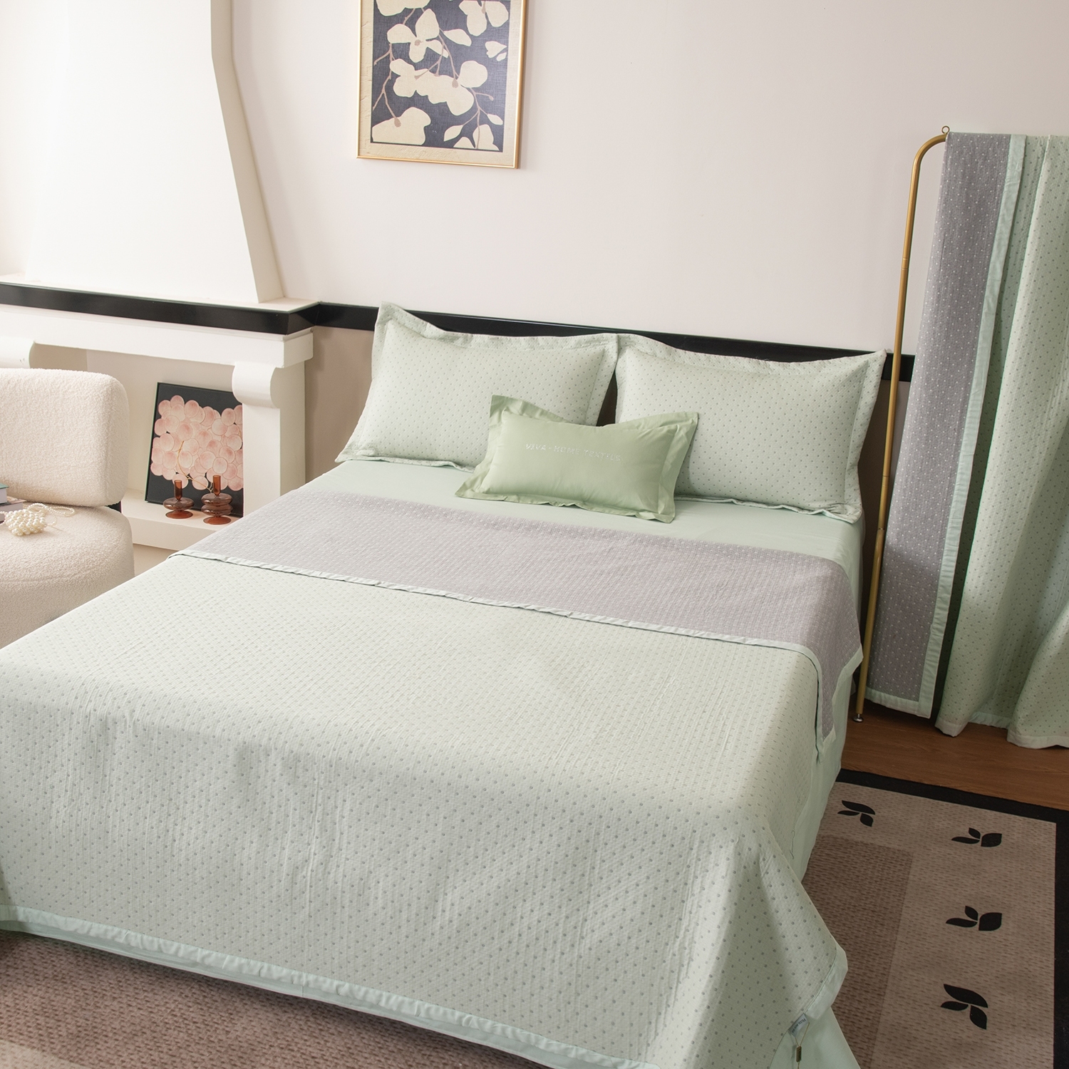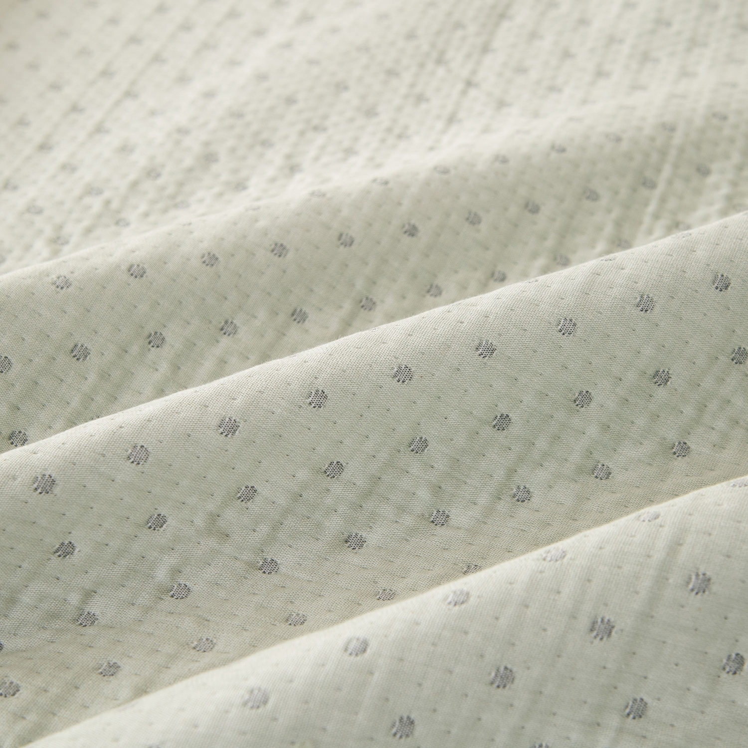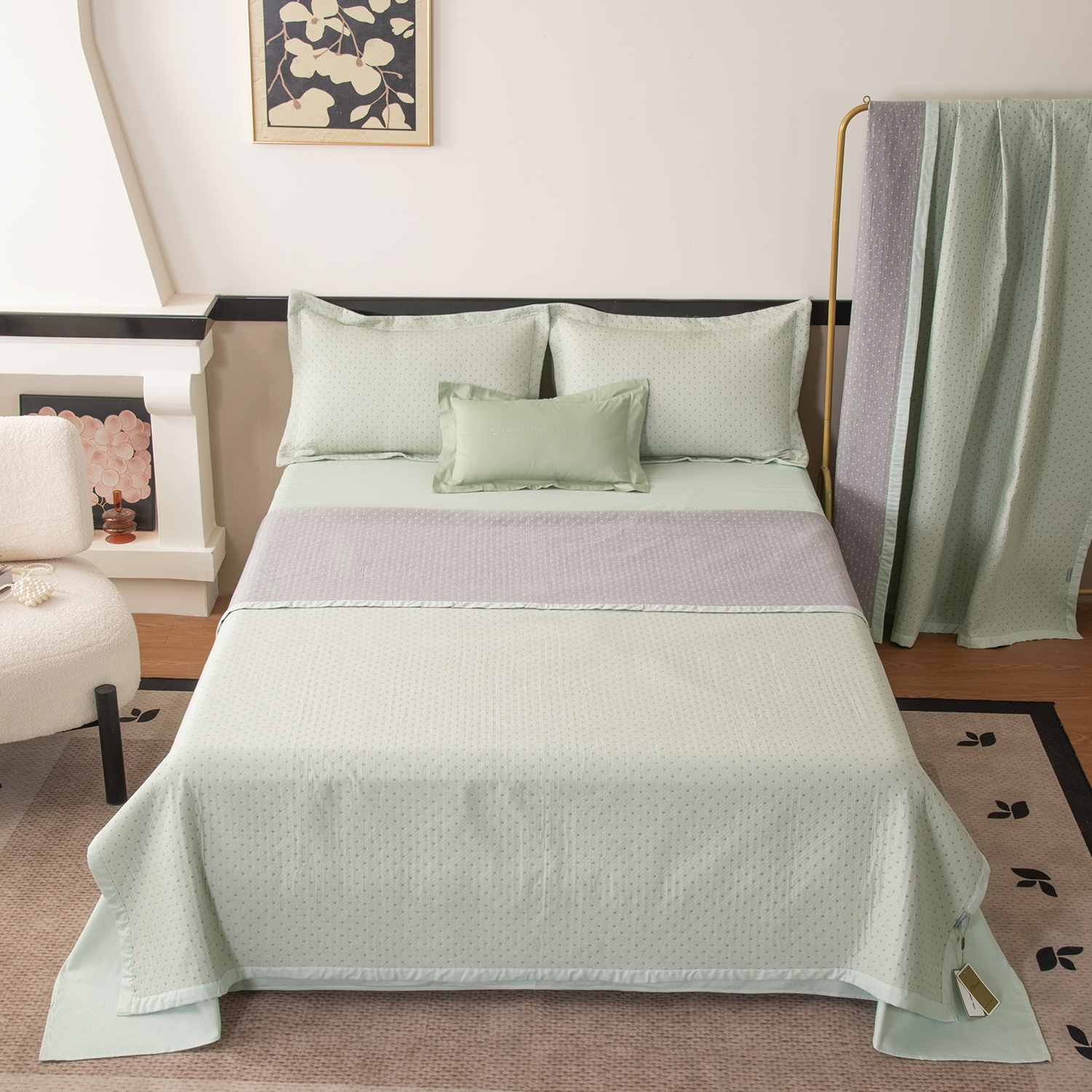 Покрывало выполнено из жаккардового муслина с декоративной простёжкой, формирующей утончённый рельефный узор. Ткань отличается мягкостью, лёгким благородным блеском и изысканной текстурой. Завершает композицию широкий кант в тон простыни, который визуально объединяет все элементы комплекта и придаёт образу гармоничную завершённость.