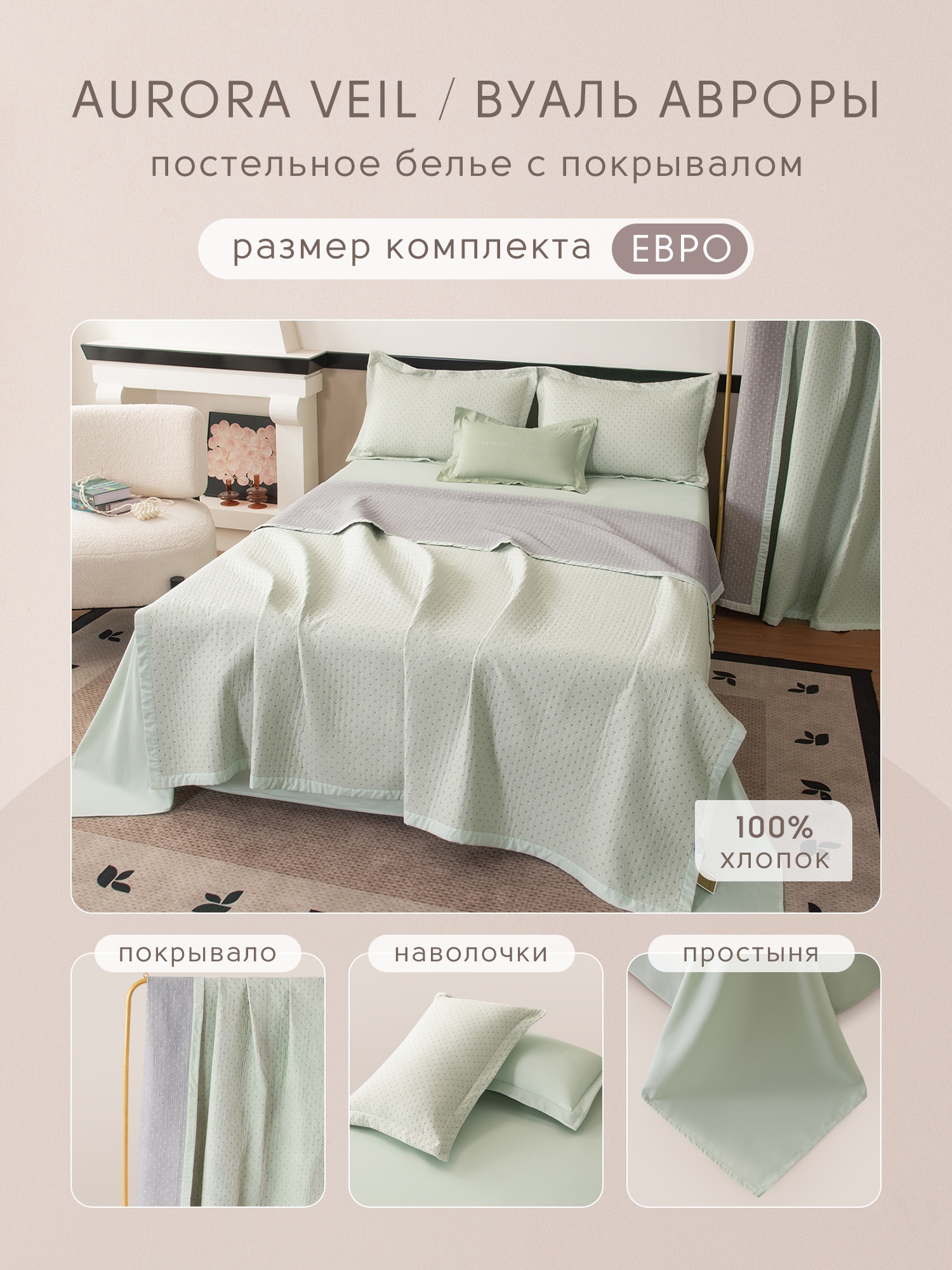 Сатин Aurora Veil/Вуаль Авроры с Покрывалом - коллекция, в которой продумана каждая деталь. Мягкое постельное бельё в комплекте с изысканным двусторонним покрывалом создаёт гармоничный, законченный образ спальни и наполняет пространство атмосферой лёгкости и уюта.