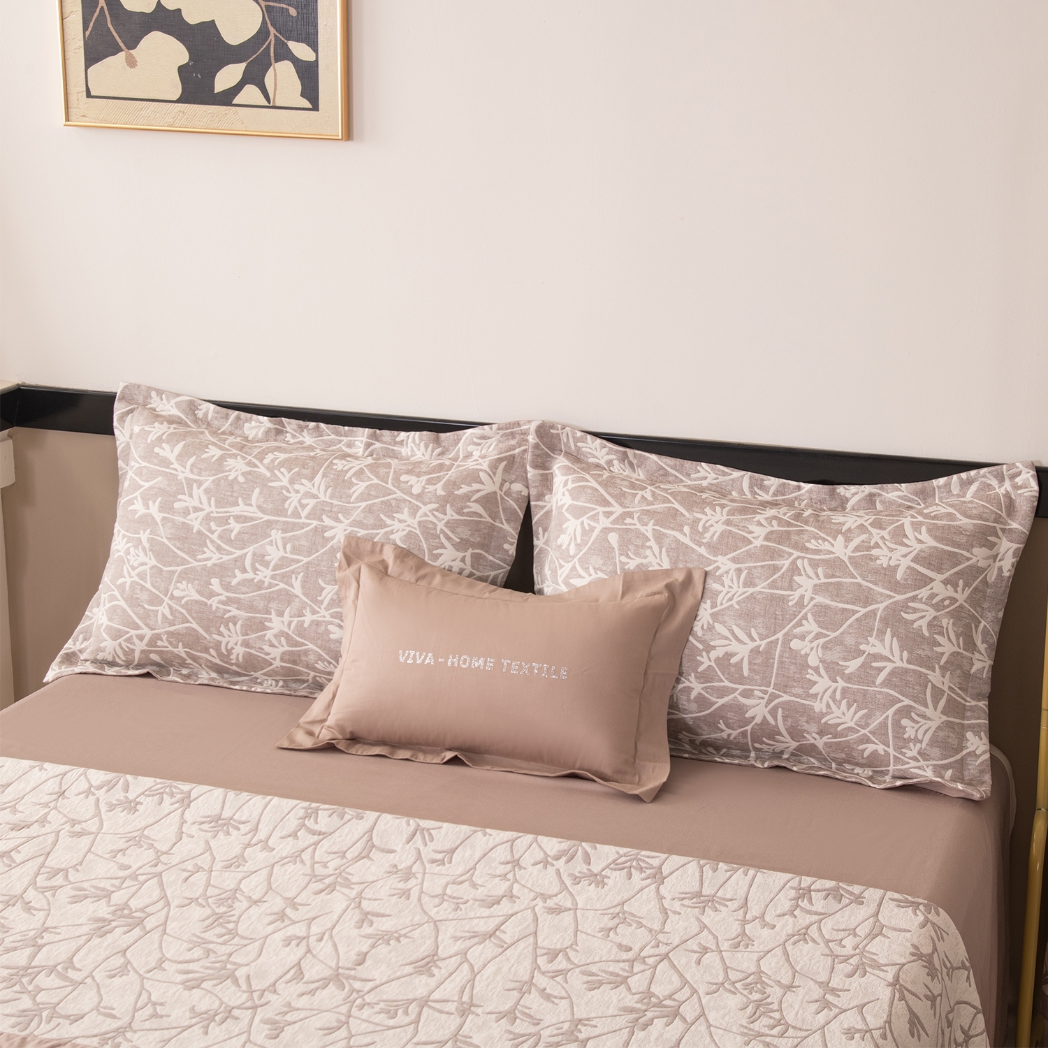 В комплект также входят однотонная простыня из люкс-сатина и две двусторонние наволочки с широким кантом по периметру. Одна сторона наволочек выполнена из жаккардового муслина с тем же изящным узором, что и покрывало, другая - из гладкого люкс-сатина, что даёт возможность комбинировать и создавать новые вариации оформления постели.