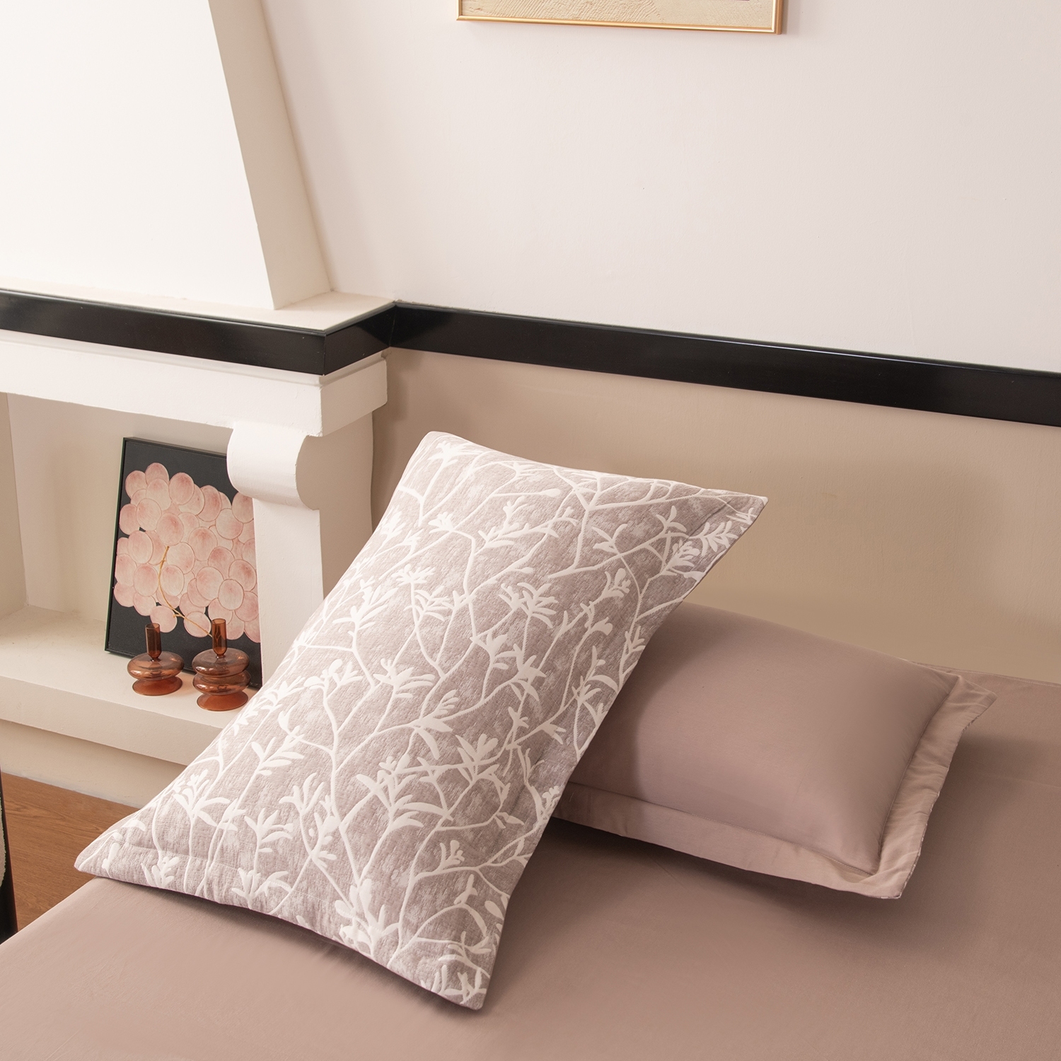 Покрывало выполнено из жаккардового муслина с декоративной простёжкой, формирующей утончённый рельефный узор. Ткань отличается мягкостью, лёгким благородным блеском и изысканной текстурой. Завершает композицию широкий кант в тон простыни, который визуально объединяет все элементы комплекта и придаёт образу гармоничную завершённость.