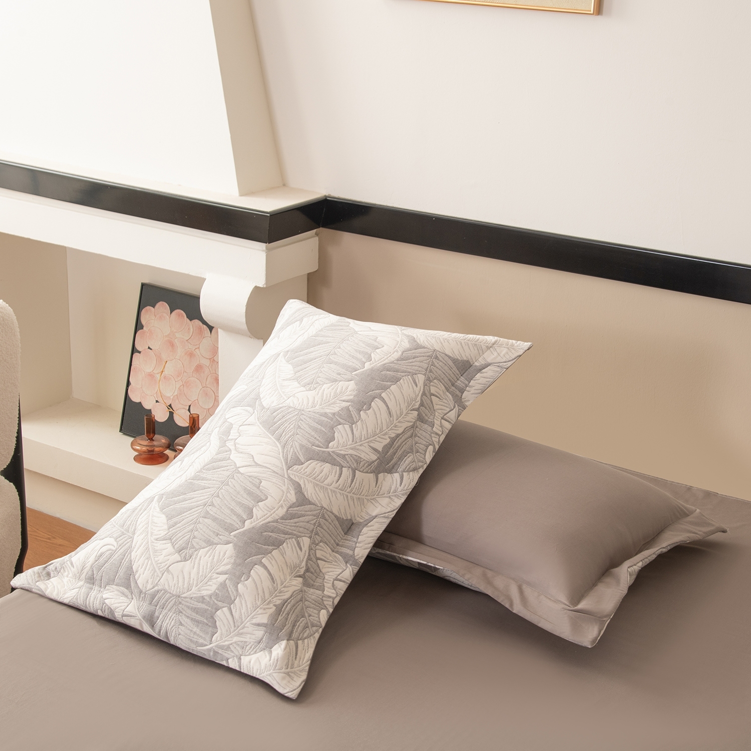 Реверсивный дизайн покрывала с инверсией оттенков позволяет выбрать настроение пространства: на одной стороне - светлый фон с мягким контрастным рисунком, на другой - более тёмный фон со светлым узором. Игра фактур и тонов делает покрывало выразительным акцентом в интерьере и позволяет легко менять облик спальни.