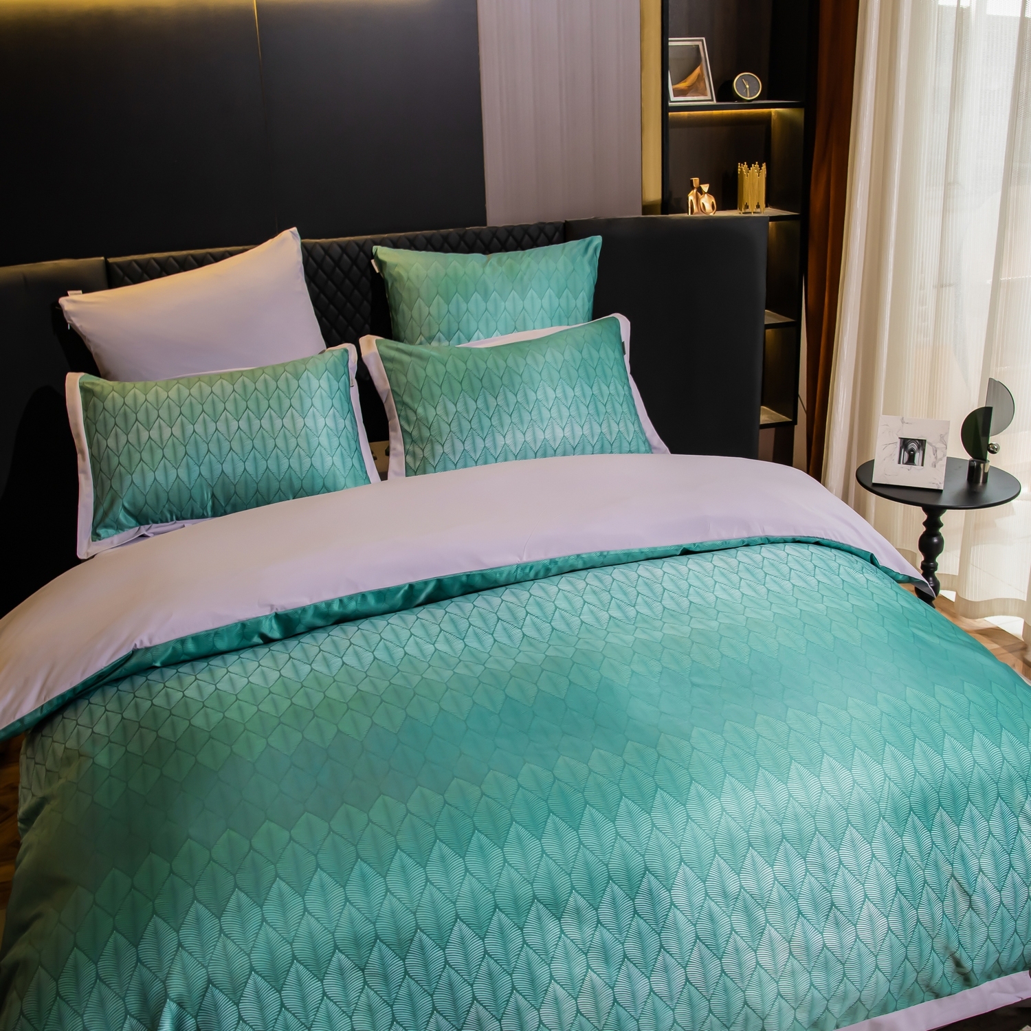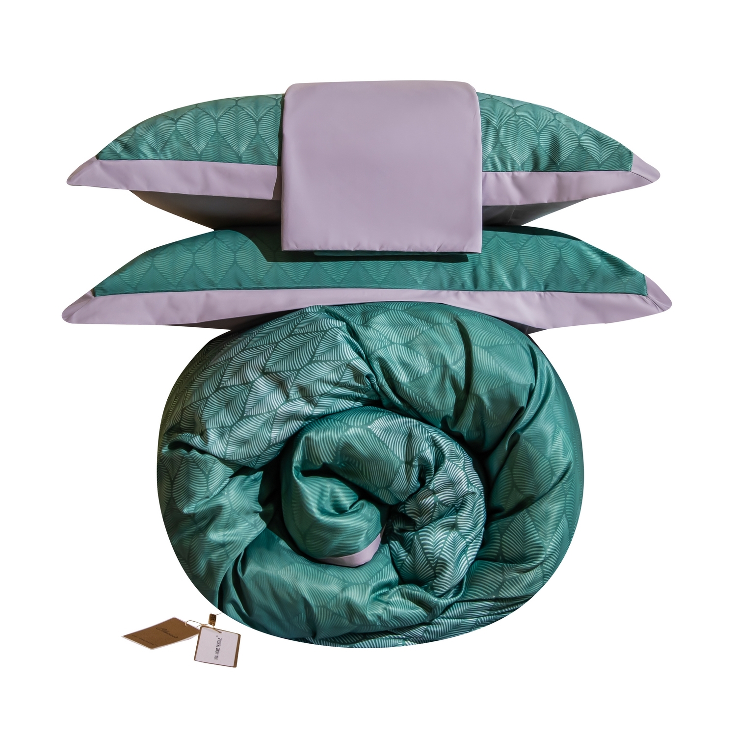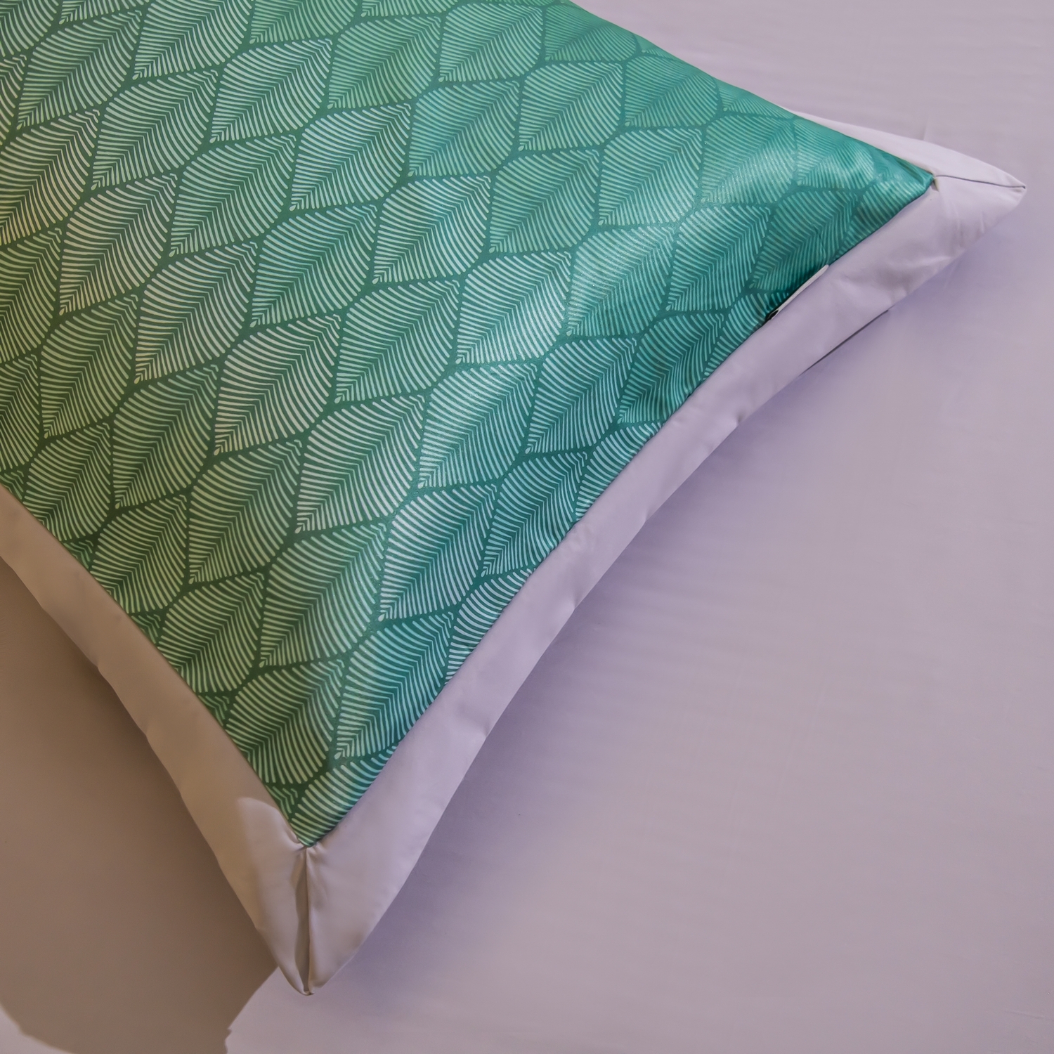 Ткань компаньон: Верх пододеяльника - мерсеризованный сатин, низ пододеяльника - сатин. Наволочки 50*70 см и 70*70 см с разных сторон разной расцветки. Пододеяльник с разных сторон разного цвета. Простыня однотонная такого же цвета, как низ пододеяльника.