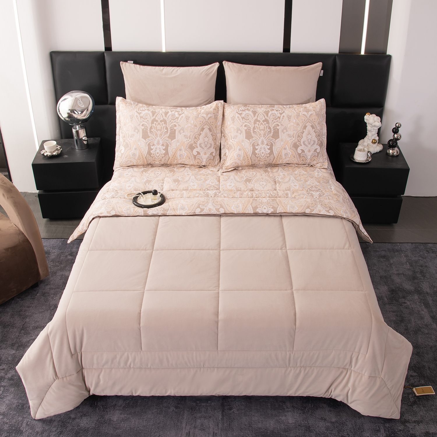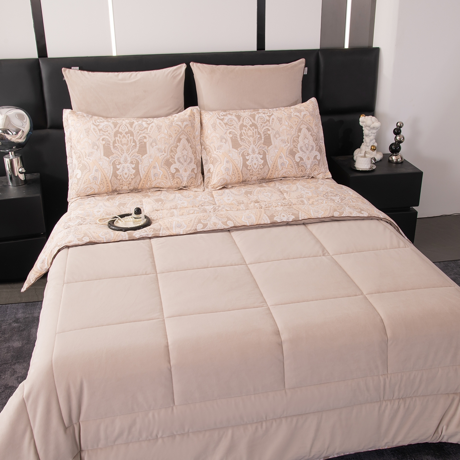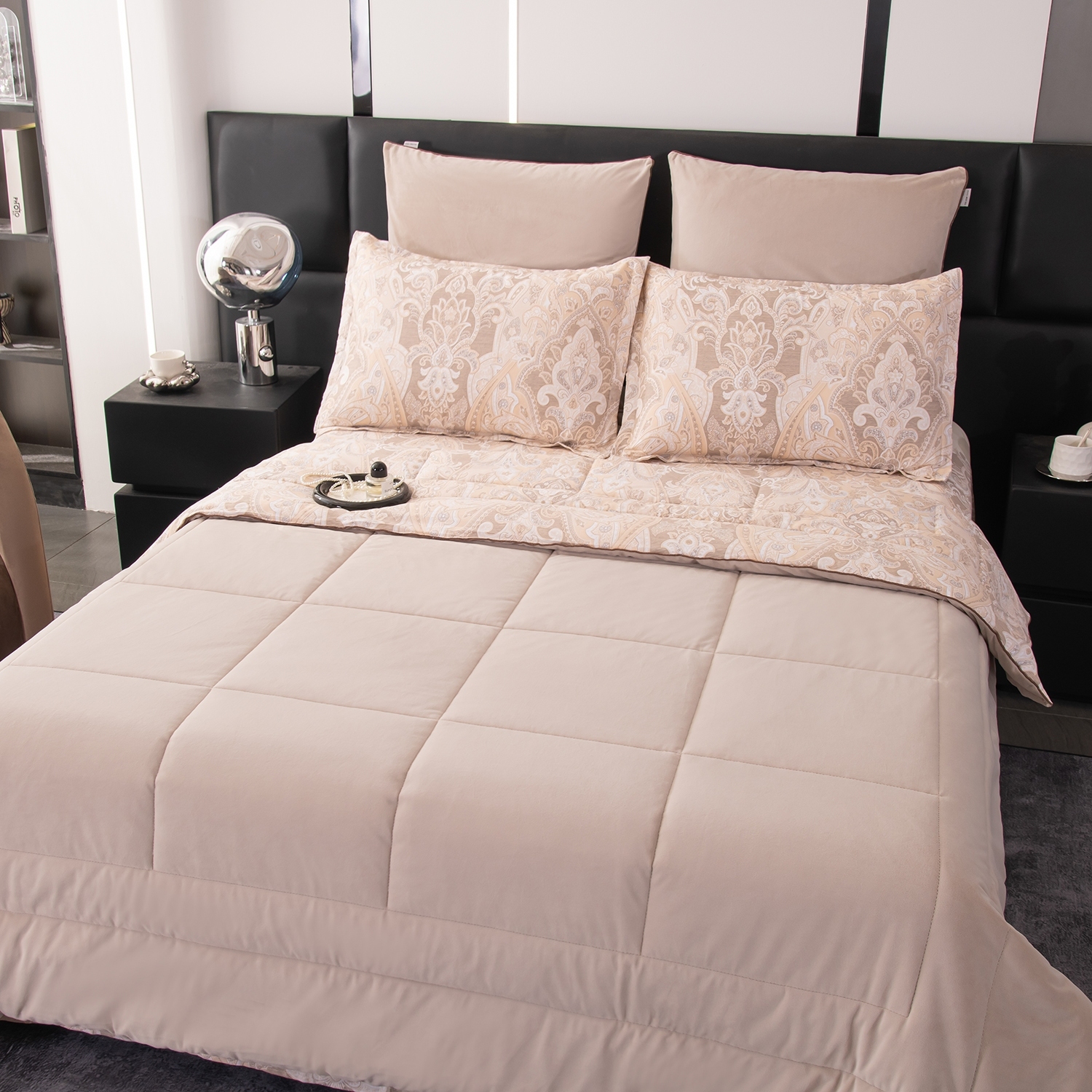 Одеяло выполнено с изысканной геометрической стёжкой и оформлено бархатным кантом. Верхняя сторона: мягкий велюр, придающий комплекту благородный вид и особую уютность, нижняя сторона: сатин из 100% хлопка, обеспечивающий естественную воздухопроницаемость и комфорт во время сна. Наполнитель: современное 100% эковолокно микрогель, лёгкое, гипоаллергенное и сохраняющее форму даже после многократных стирок. Зимой под таким одеялом тепло и уютно, а летом благодаря отличной циркуляции воздуха не будет жарко.
