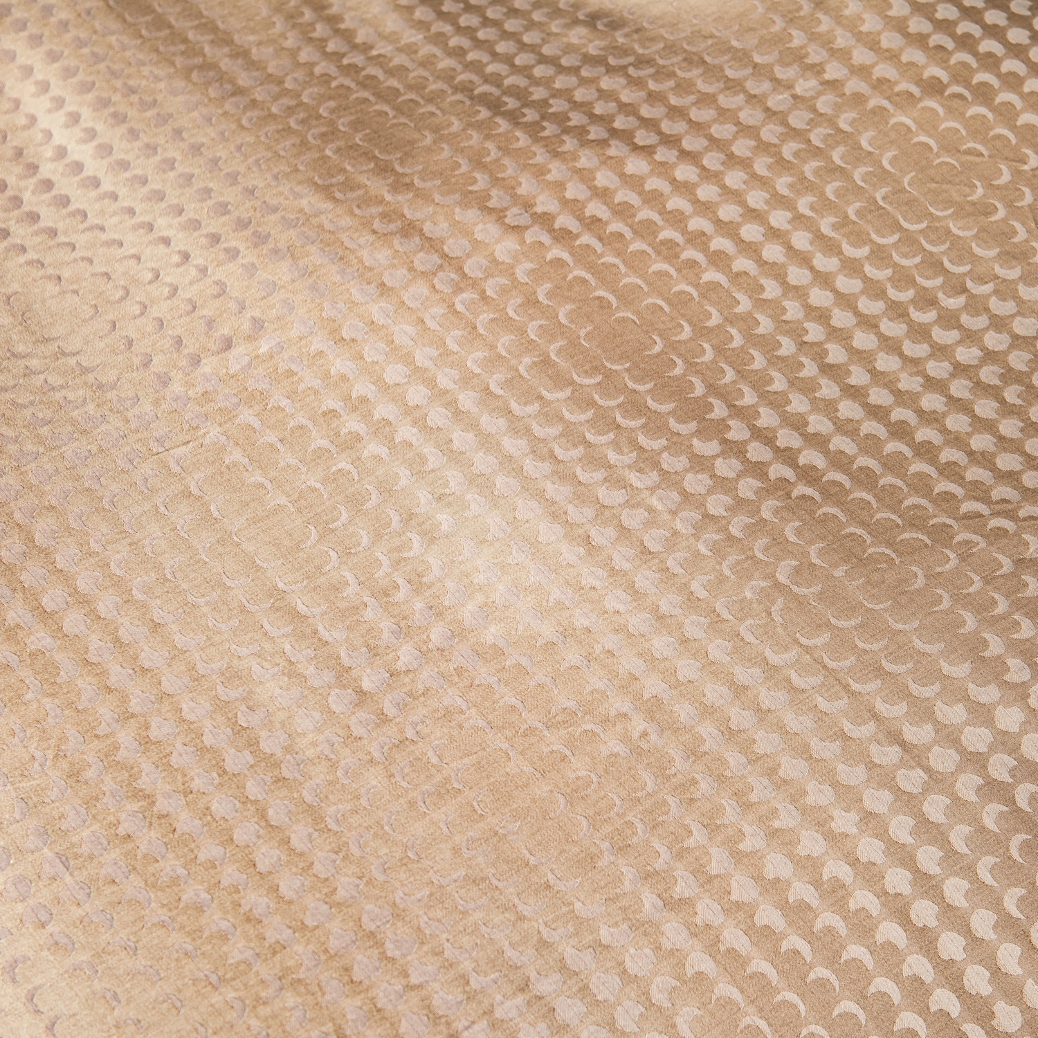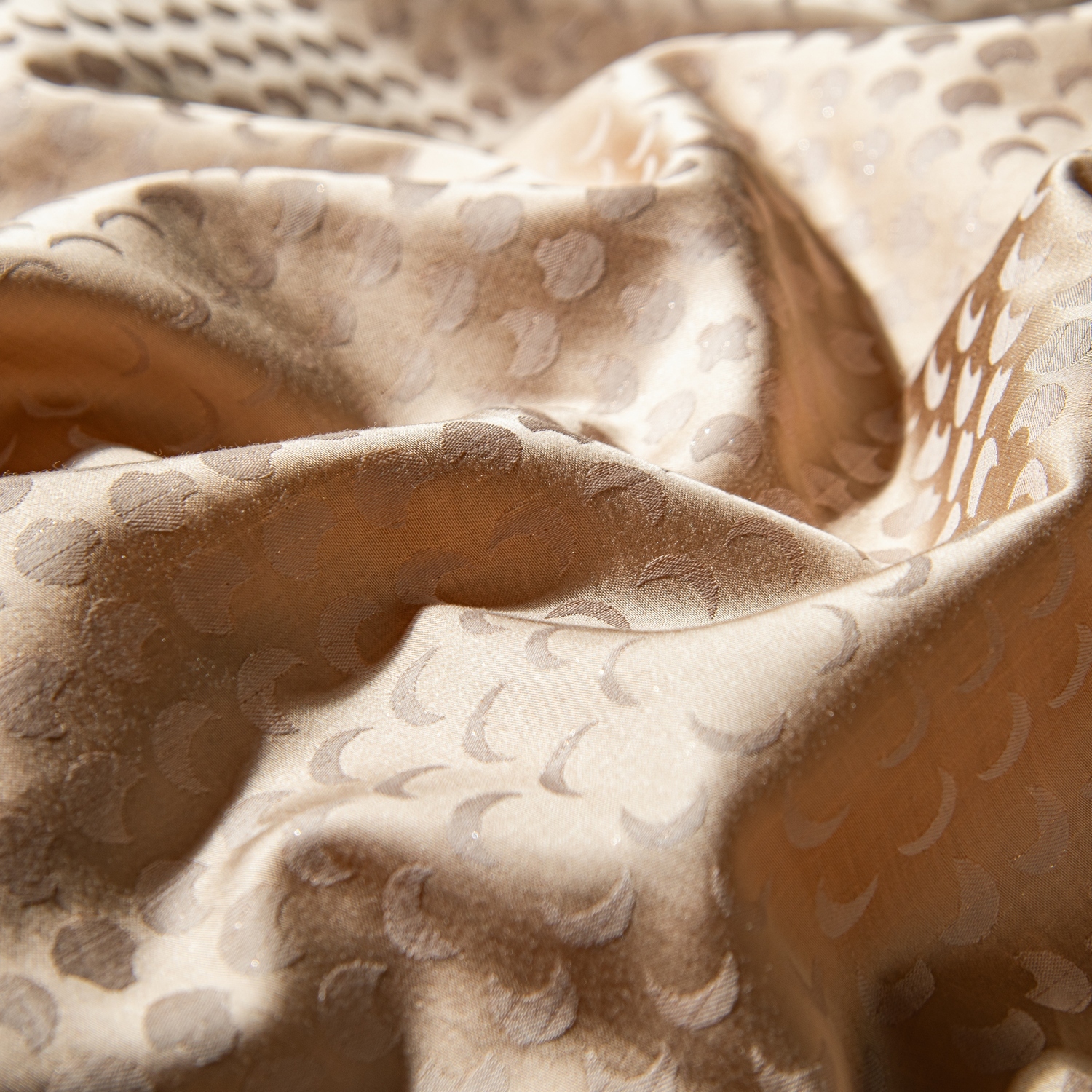Жаккард из 100% хлопка, сотканный на специальных станках, впечатляет сложным рельефным рисунком. В переплетении используются тонкие золотые нити, которые мягко играют на свету, создавая мерцающий эффект, глубину узора и ощущение изысканной роскоши. Такой текстиль выглядит статусно и подчёркивает индивидуальность интерьера.