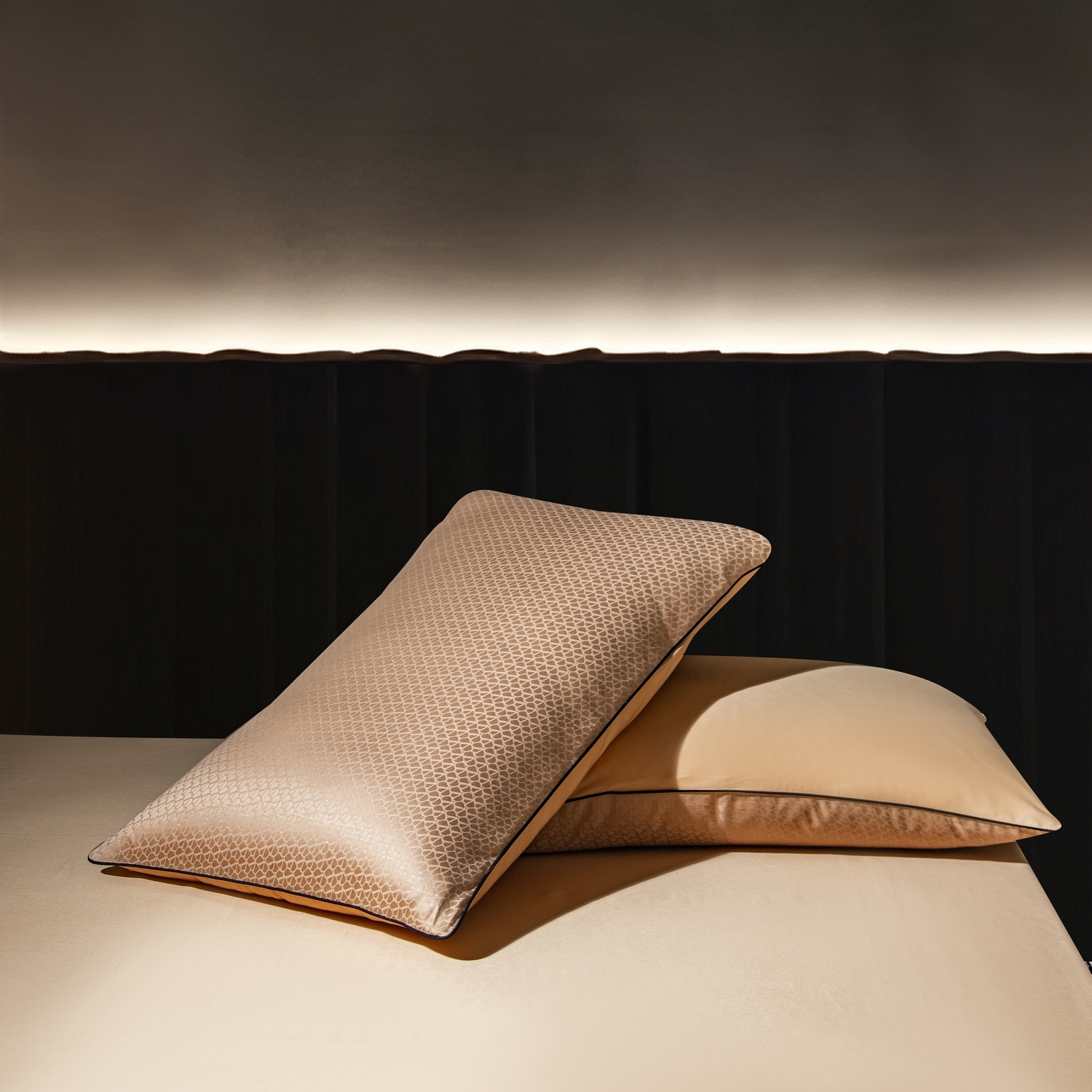 - Наволочки 50x70 выполнены с разных сторон из разных тканей: лицевая сторона - жаккард с золотыми нитями, оборотная - гладкий сатин.