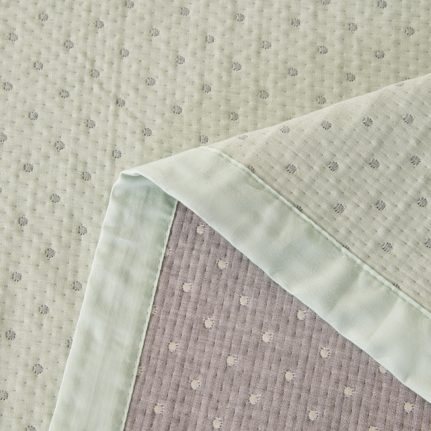 Покрывало выполнено из жаккардового муслина с декоративной простёжкой, формирующей утончённый рельефный узор. Ткань отличается мягкостью, лёгким благородным блеском и изысканной текстурой. Завершает композицию широкий кант, придающий изделию гармоничную завершённость.