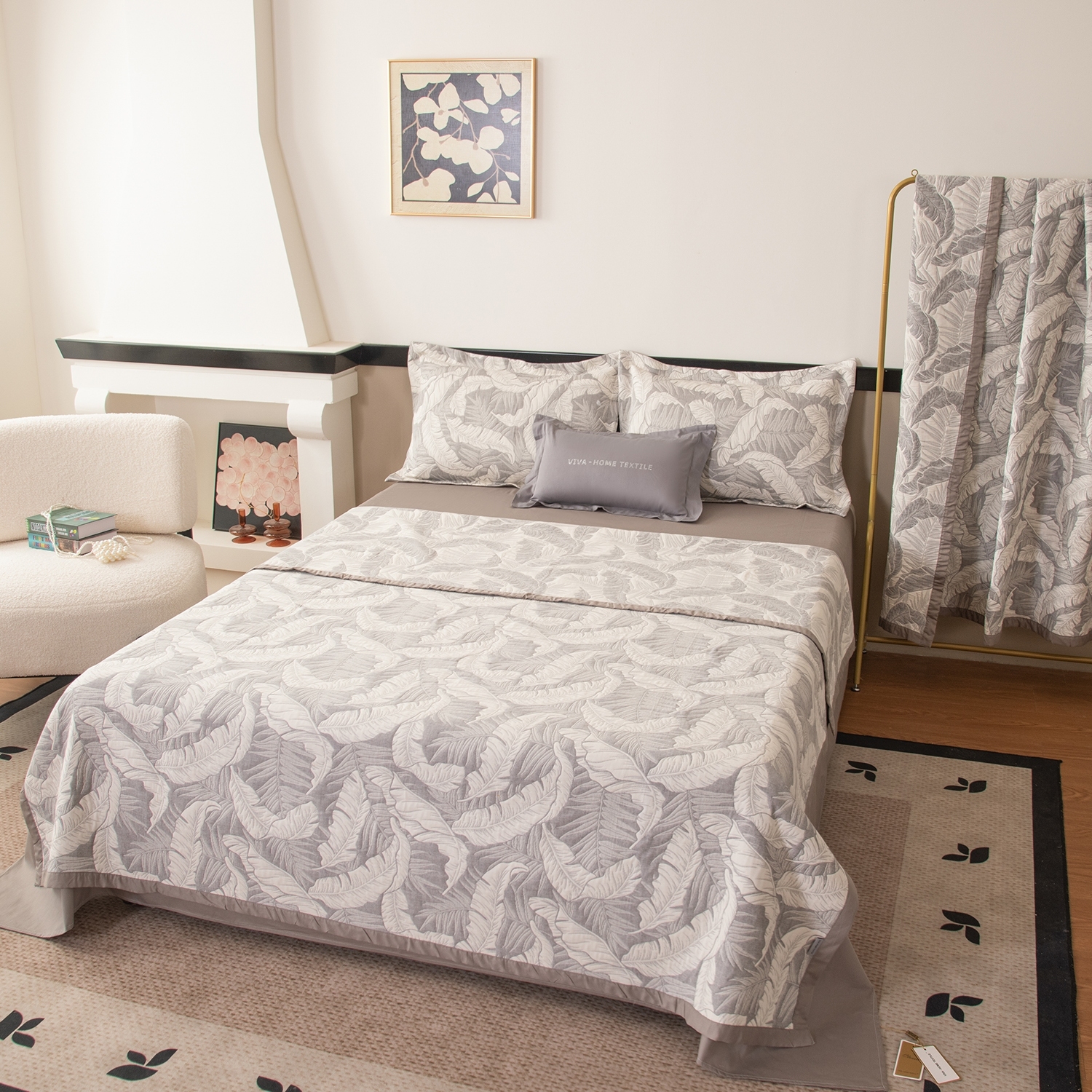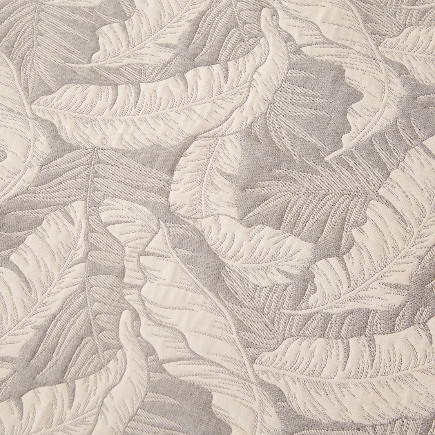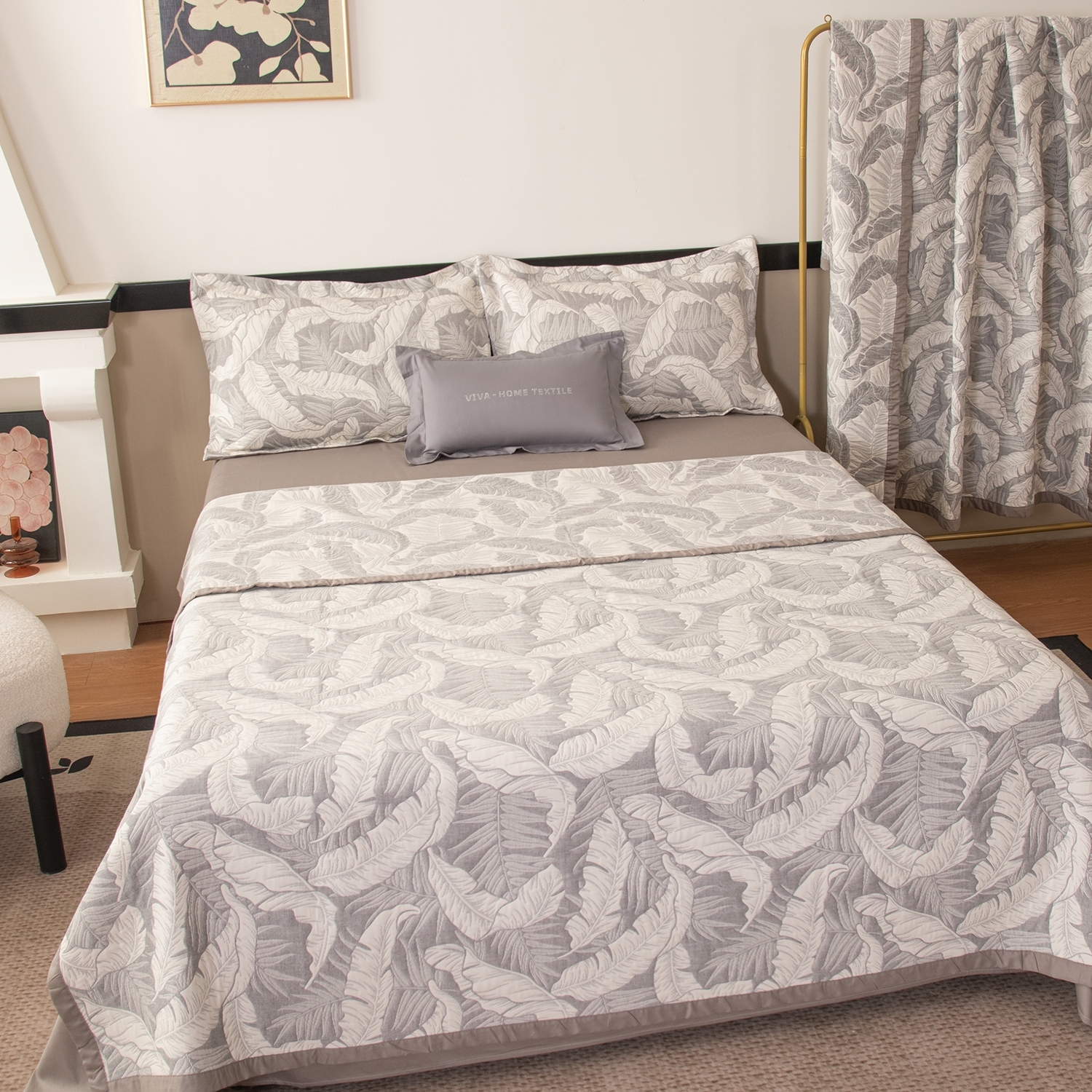Покрывало выполнено из жаккардового муслина с декоративной простёжкой, формирующей утончённый рельефный узор. Ткань отличается мягкостью, лёгким благородным блеском и изысканной текстурой. Завершает композицию широкий кант, придающий изделию гармоничную завершённость.