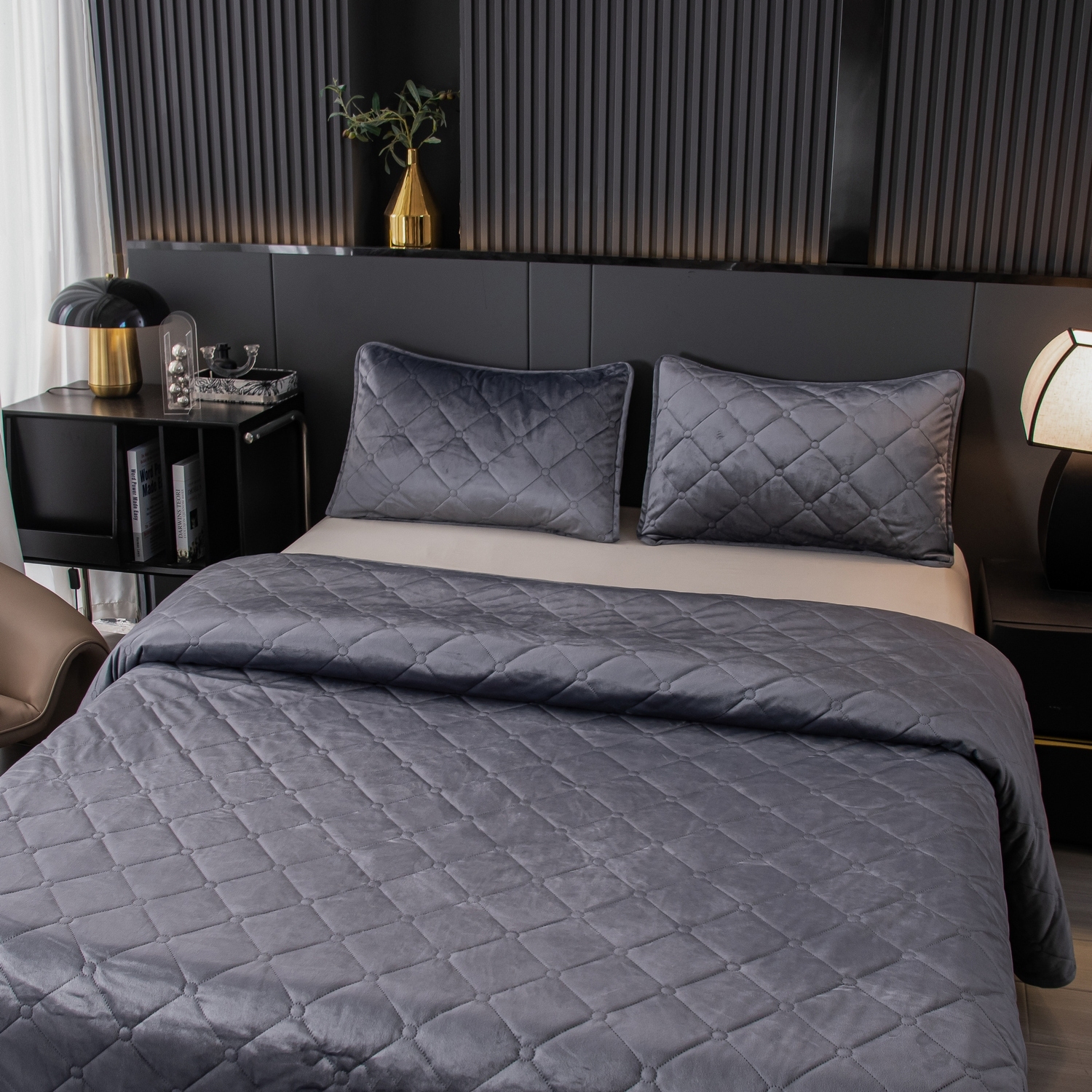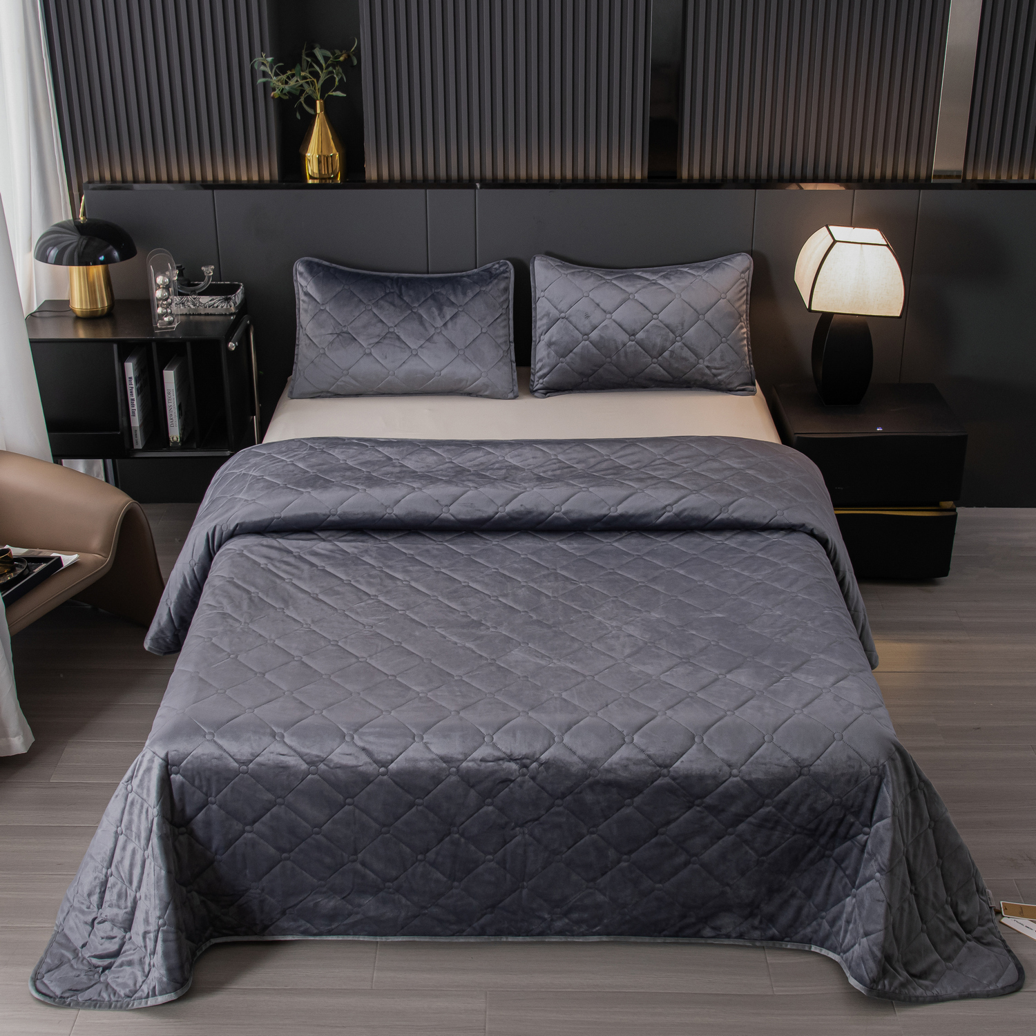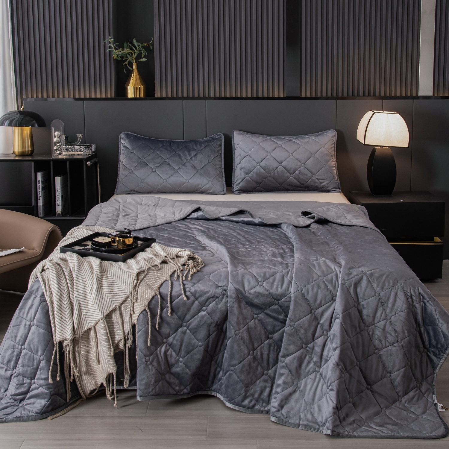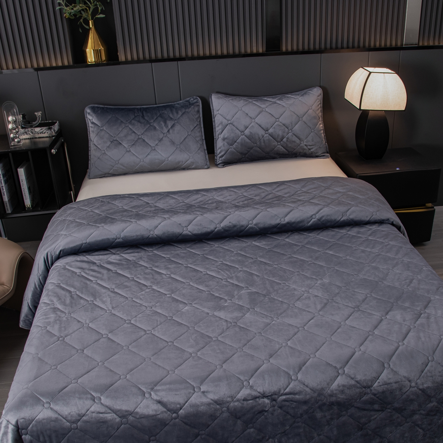Велюровое покрывало с ромбовидной стежкой: мягкая текстура велюра и приятная цветовая гамма станут прекрасным дополнением интерьера вашей спальни. Кровать с таким покрывалом будет выглядеть стильно и дорого.