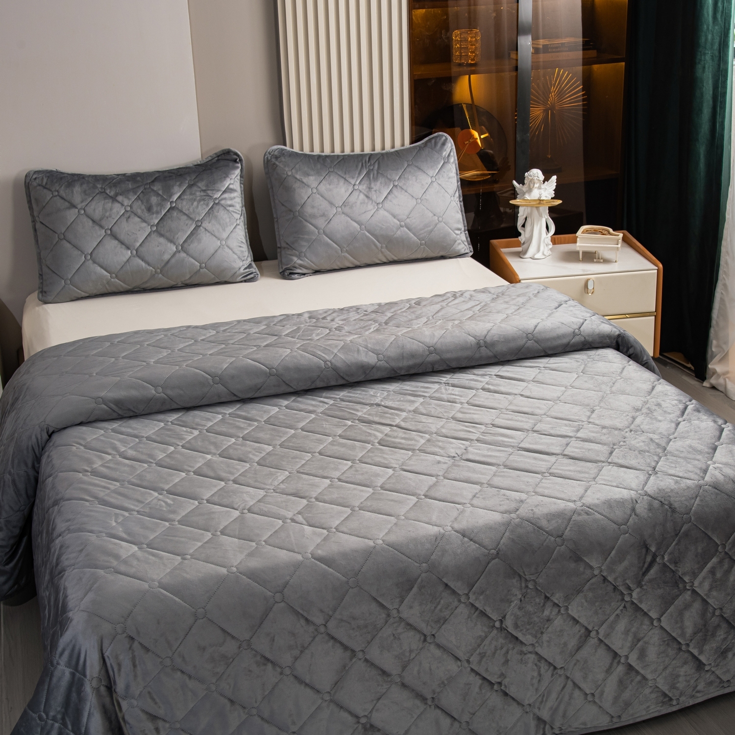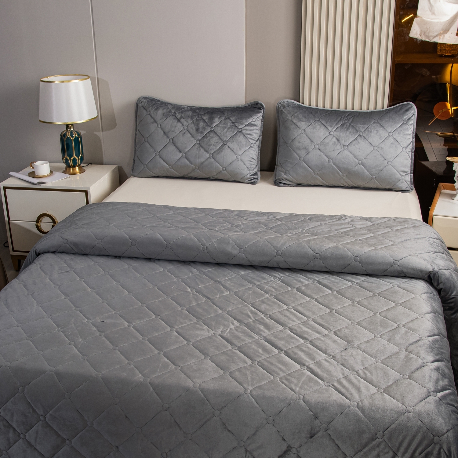 Велюровое покрывало с ромбовидной стежкой: мягкая текстура велюра и приятная цветовая гамма станут прекрасным дополнением интерьера вашей спальни. Кровать с таким покрывалом будет выглядеть стильно и дорого.